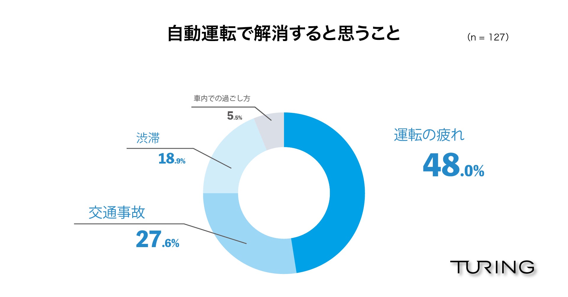 自動運転によってどんな心配ごとが最も解消すると思うか尋ねたところ、「運転の疲れ」が48.0%で最も多く、「交通事故」が27.6%、「渋滞」が18.9%と続きました(n=127)。