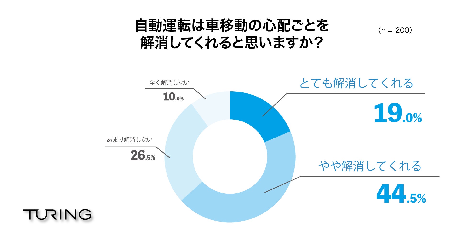 自動運転は車移動の心配ごとを解消してくれると思うか尋ねたところ、「とても解消する」「やや解消する」が合わせて63.5%と、6割以上が自動運転は心配ごと解消に繋がると思っていることがわかりました(n=200)。