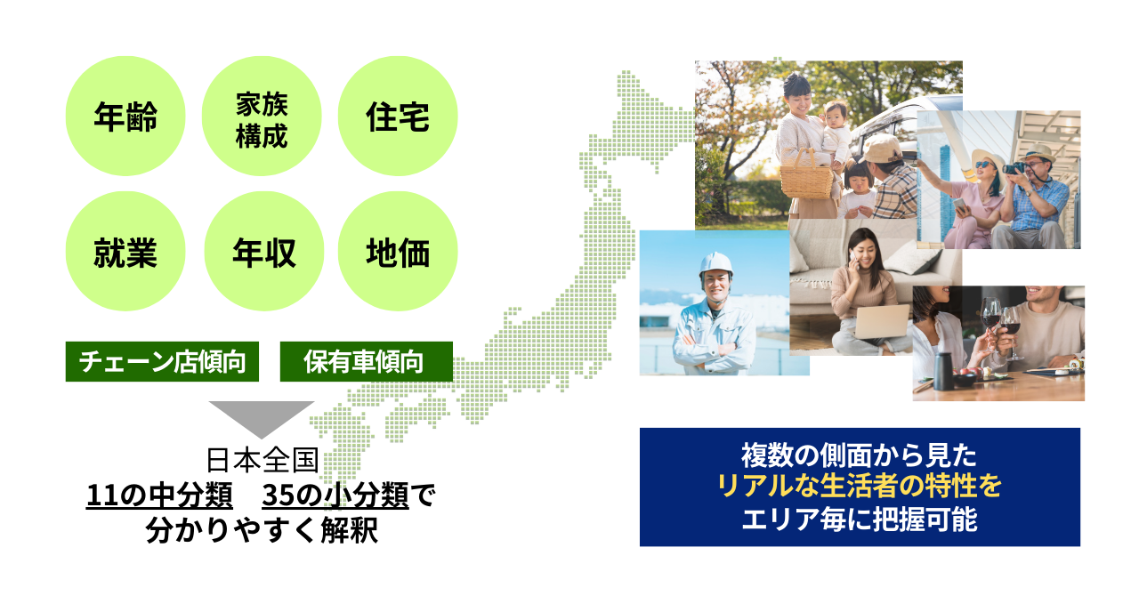 c-japan🄬は、日本全国(町丁目/郵便番号界)を、年齢/家族構成/住宅/職業等や年収/地価等を当社独自の特許技術※により11の中分類・35の小分類にクラスタリング(分類)したエリアセグメンテーションデータです。