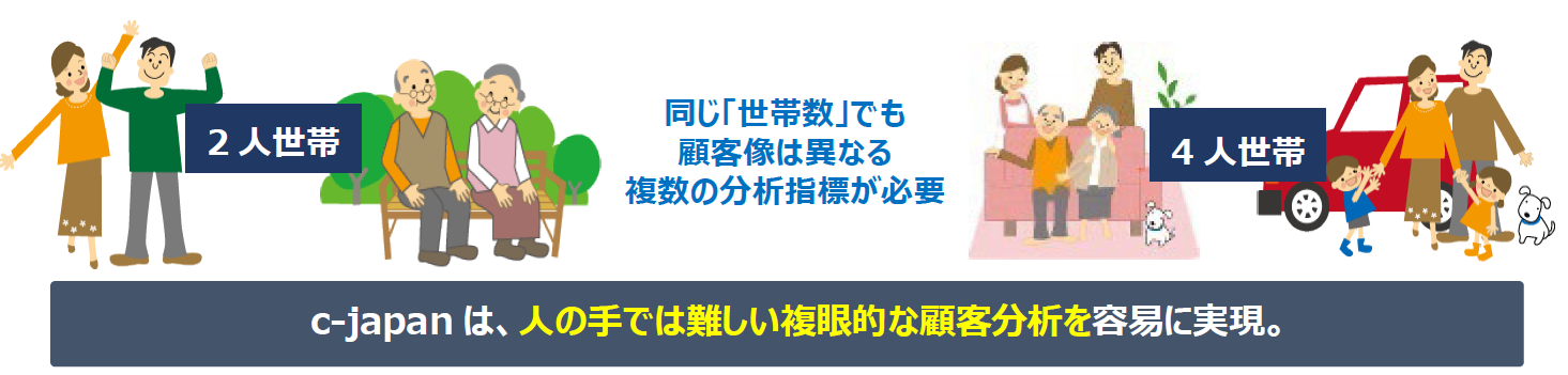 「c-japan🄬」は、年齢や家族構成、住宅、就業等の特性に「年収」や「地価」も加味した独自の分類技術を用い、居住者のペルソナ像を町丁目や郵便番号界でマーケティング分析にフィットしやすい形に分類しています。なお、各セグメントをより深く理解できるよう、自動車保有状況やチェーン店舗の出店状況も踏まえたきめ細かな解釈を行っています。広告ターゲティングやMD・出店等の店舗戦略で重要となる“顧客ペルソナ像の具体化”に役立ち、顧客との戦略的なコミュニケーション設計に寄与します。