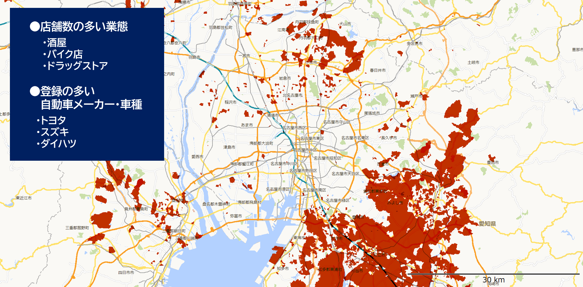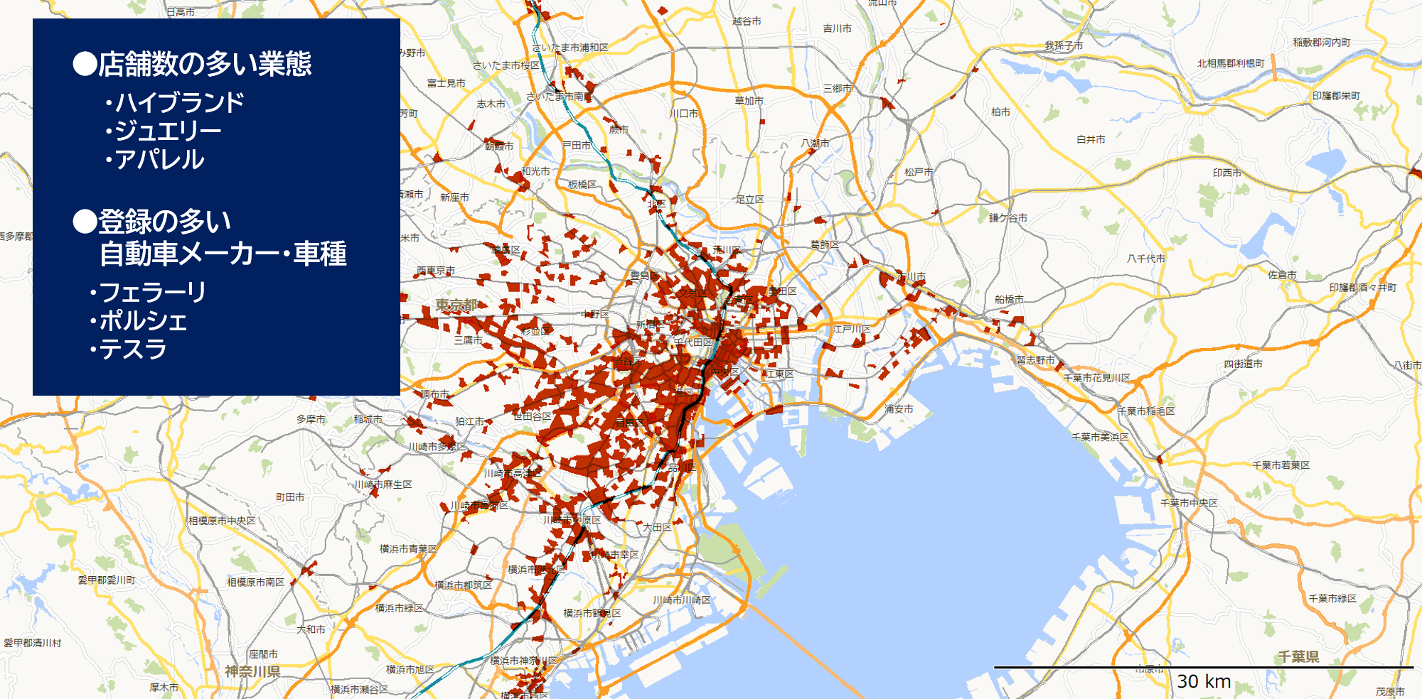 セグメント毎に『チェーン店の出店傾向』や『保有自動車の車種傾向』もレポート可能です