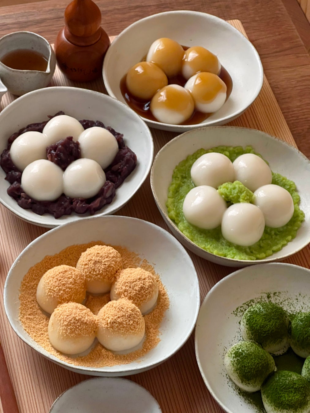 もっちもちの白玉の上に素材にこだわった4種類の味が楽しめ、味ごとに専用のみつや調味料が付きます。