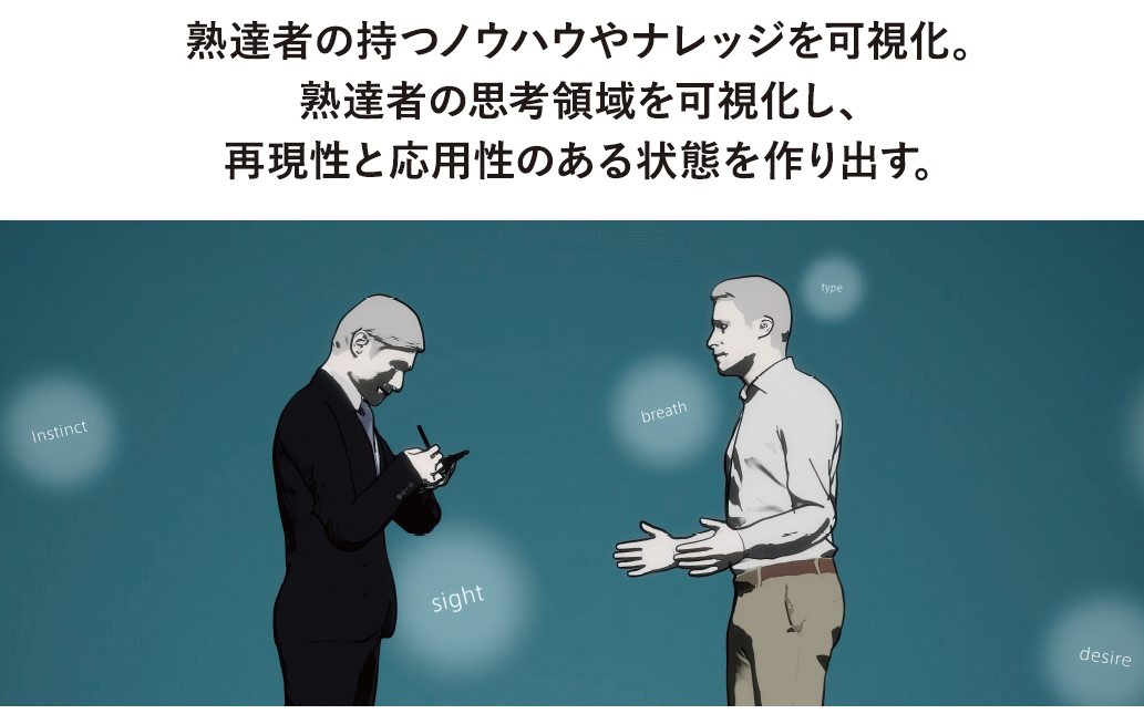 熟達者が持つ経験や知見、洞察の視点を次世代につなぐため、その人が持つ「専属知、専門知」を後世の人々が使いやすい活用形態に変換すること。