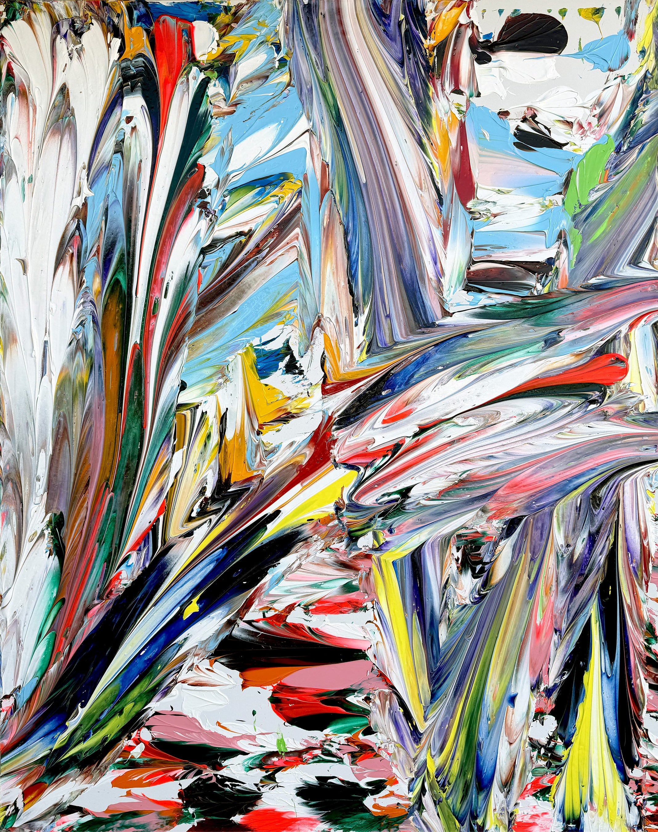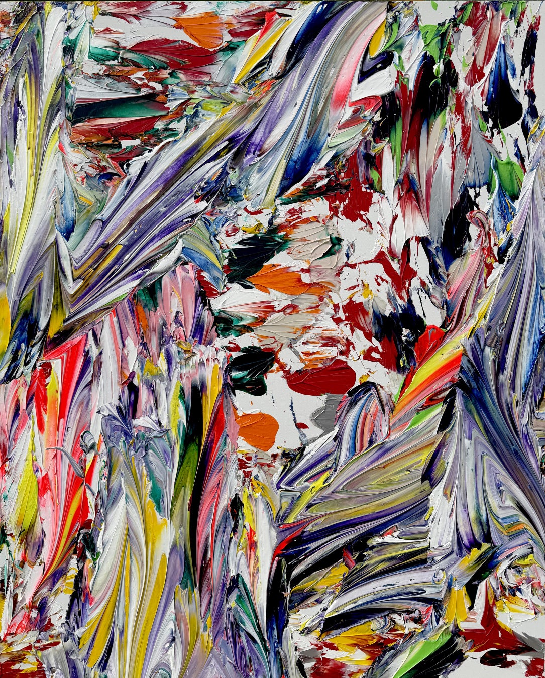 その作品においては、ダイナミックな筆致と色彩がせめぎ合い、空間と絵画行為の境界が絶えず揺らぎ、融解していきます。これは、抽象表現主義が到達した平面性の可能性を継承しつつ、東洋哲学的な思想を絵画構造へと昇華させる試みでもあります。