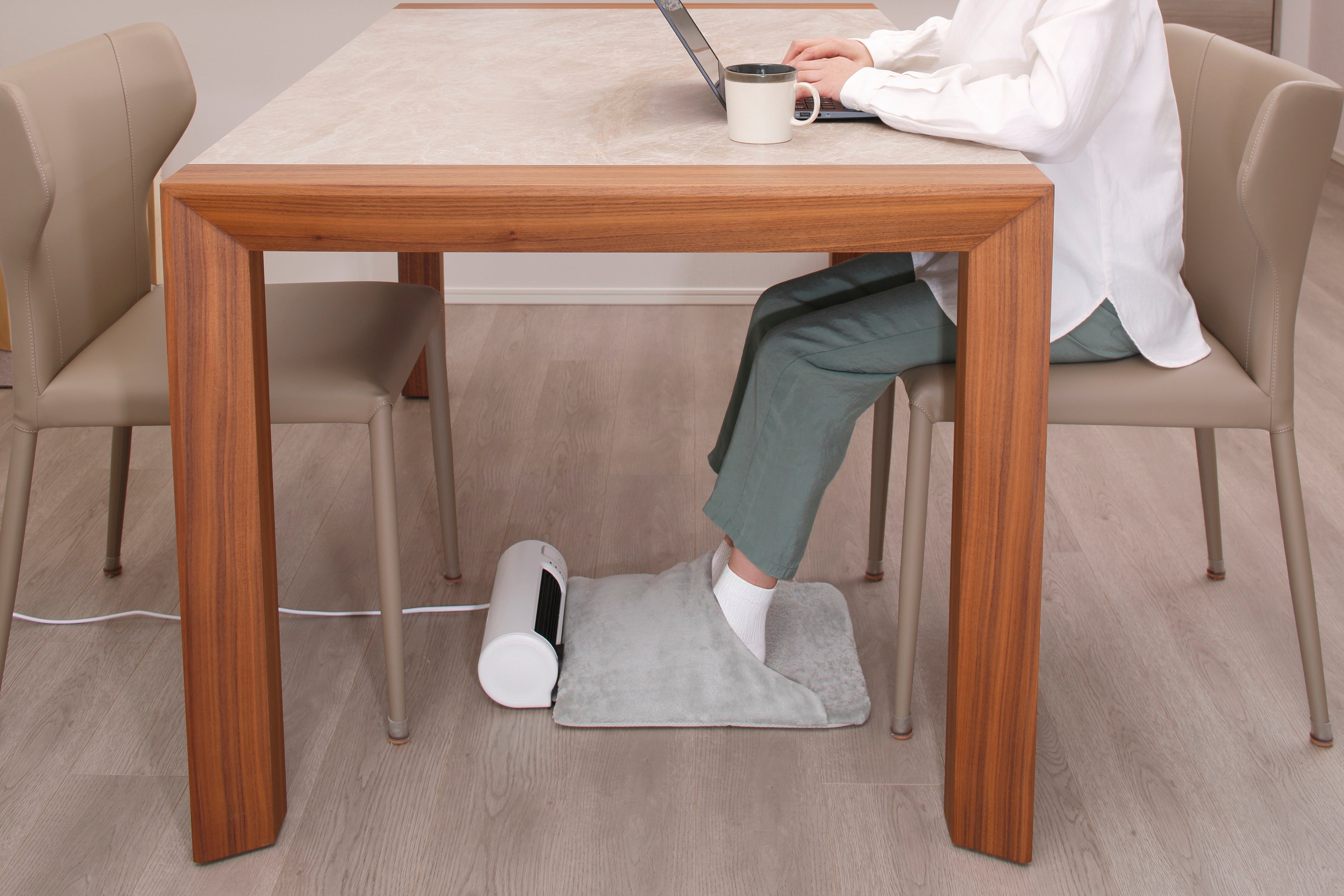 お仕事時間はもちろん、ソファで過ごすリラックスタイムや、テーブルで新聞や雑誌を読んで過ごす時間にも快適な足元温度を提供します。冷えやすい膝下の暖めに特化したあったかステーションは、冬場のエアコン暖房による乾燥を気にせず必要な部分のみを暖めることができる強い味方です。