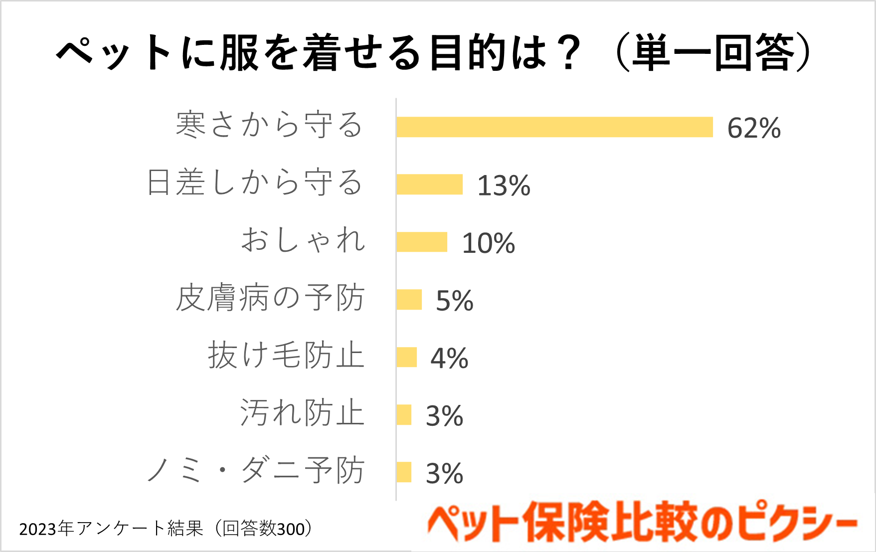 今回のアンケートから、飼い主さまは、寒さや日差しなどからペットを守るために洋服を着せていることがわかりました。