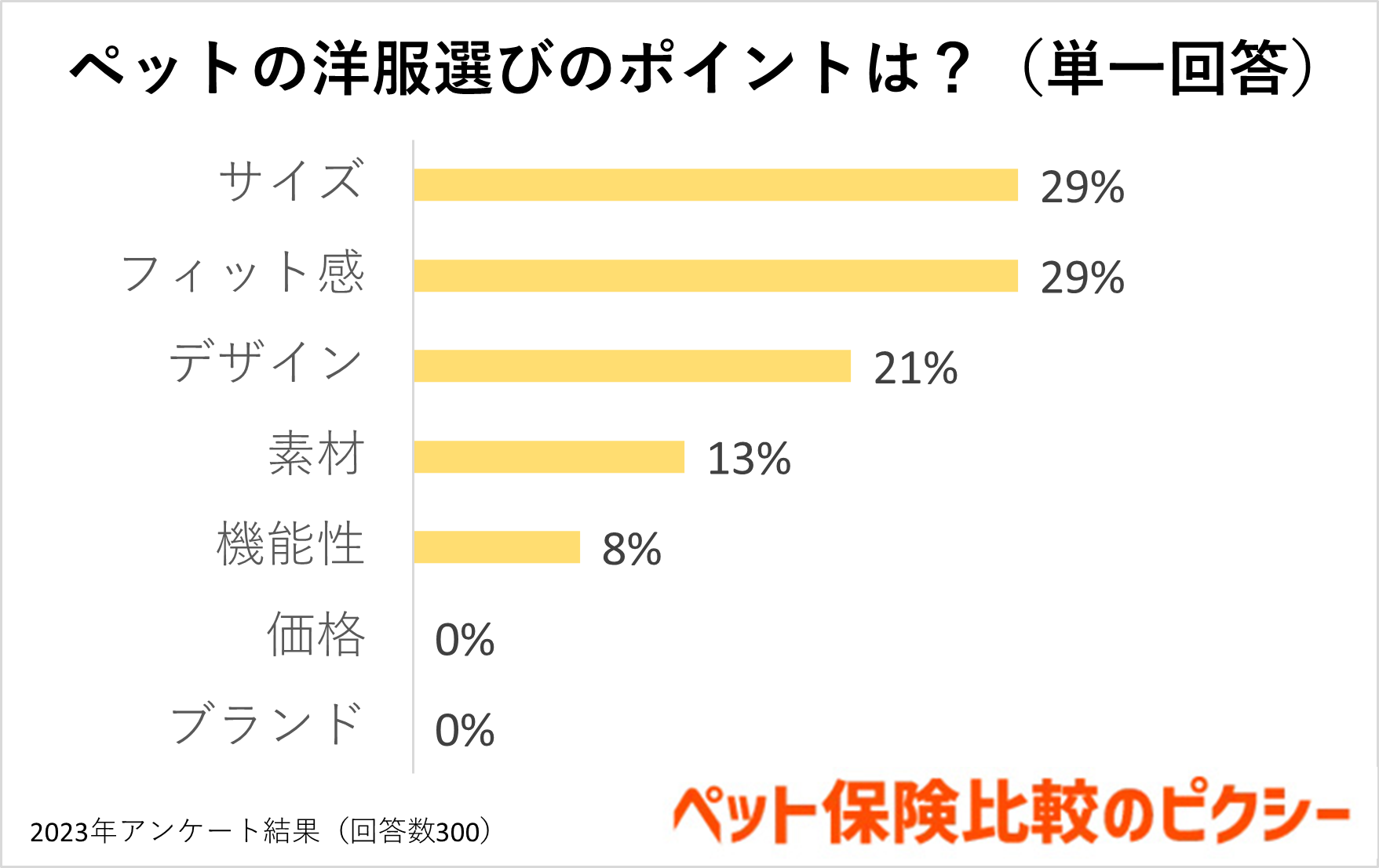 ペットの洋服選びのポイントを聞いたところ、1位は「サイズ(29%)」、「フィット感(29%)」でした。最適なサイズの洋服や、身体にフィットする洋服を選ぶことで、ペットは動きを制限されず自由に過ごせるでしょう。