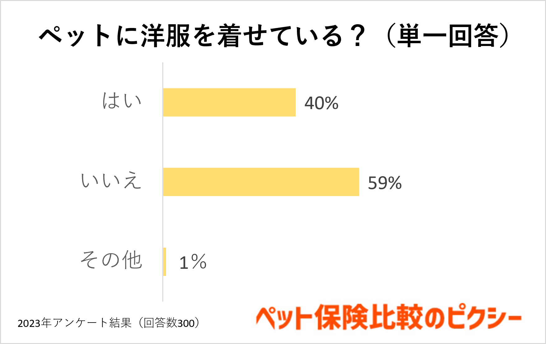 まず、ペットに洋服を着せているかについて聞いたところ、40%が「はい(着せている)」、59%が「いいえ(着せていない)」と答えました。