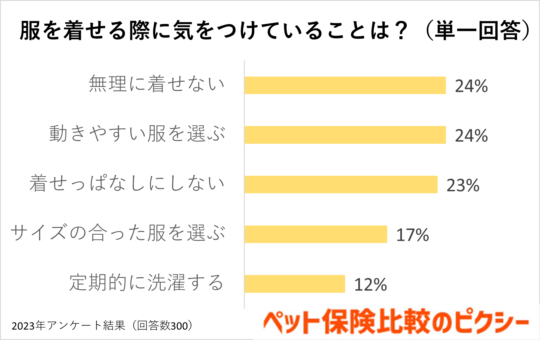 犬や猫に服を着せる際に気をつけていることを質問したところ、1位は同率で「無理に着せない(24%)」「動きやすい服を選ぶ(24%)」となりました。ペットのためとはいえ、ストレスをかけたくない、という飼い主さまが多いのではないでしょうか。洋服を着ることによって、ペットの自由が制限されないかについてもよく気を配っていることがうかがえます。