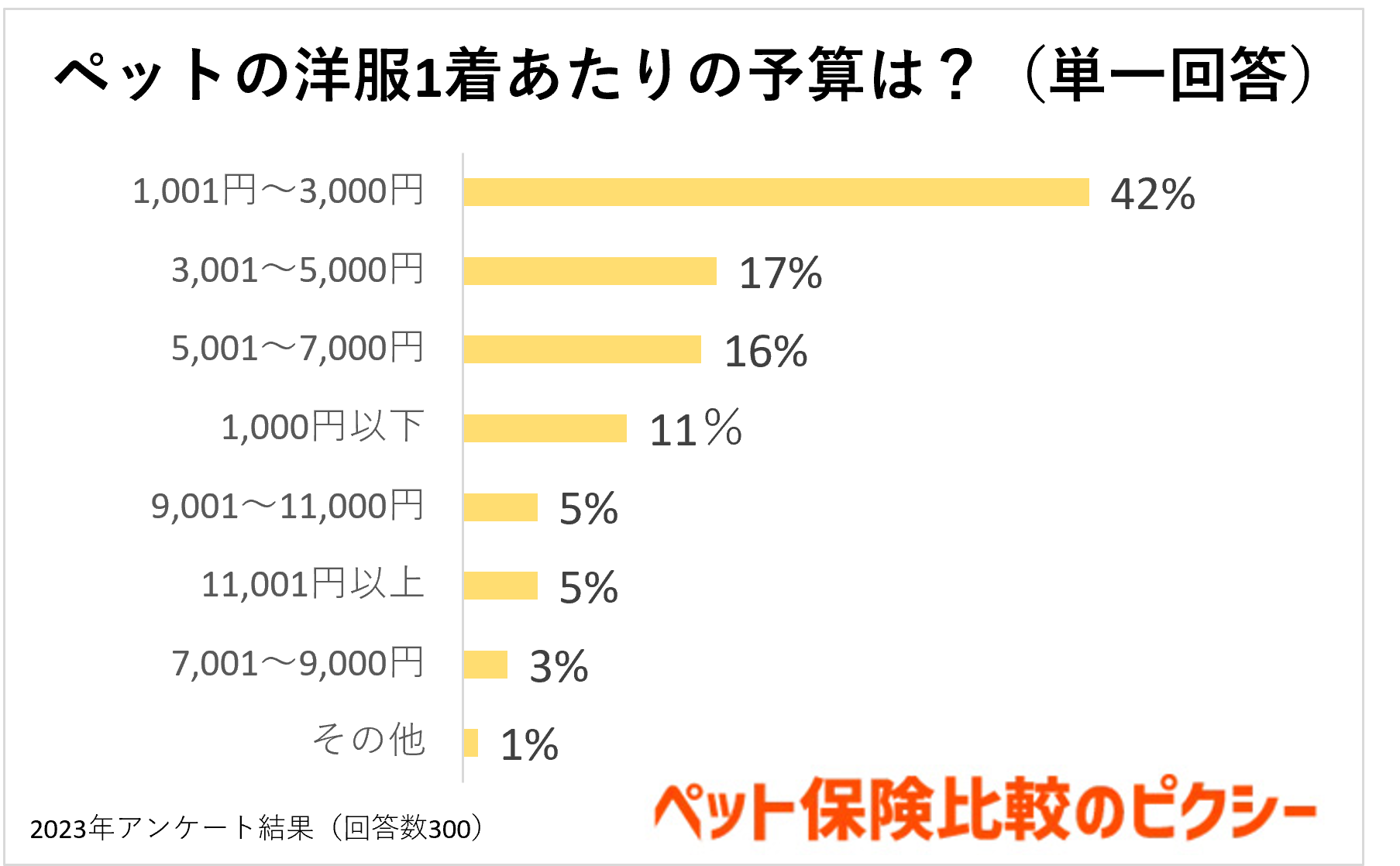 5位は「9,001~11,000円(5%)」、6位は「11,001円以上(5%)」でした。1万円前後の洋服を選んでいる飼い主さまは全体の1割と少ない結果となっています。高価格帯の洋服はペットには必要ないと思う方も多いのかもしれません。