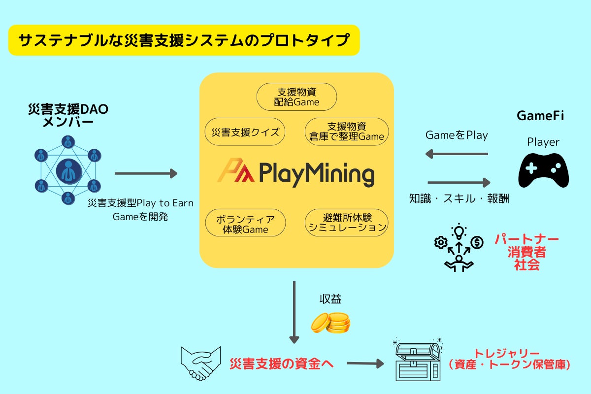 まずはサステナブルな災害支援を目指す人・企業・団体(出資者を含む)がDAO(分散型自律組織)を形成します。次にDAOに集まるメンバーで、GameFi(Game +Finance)である災害支援型Play to Earnゲームを開発し、災害支援活動のための資金を生み出していくシステムを目指します。