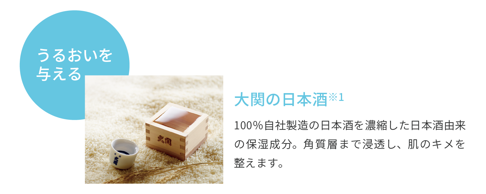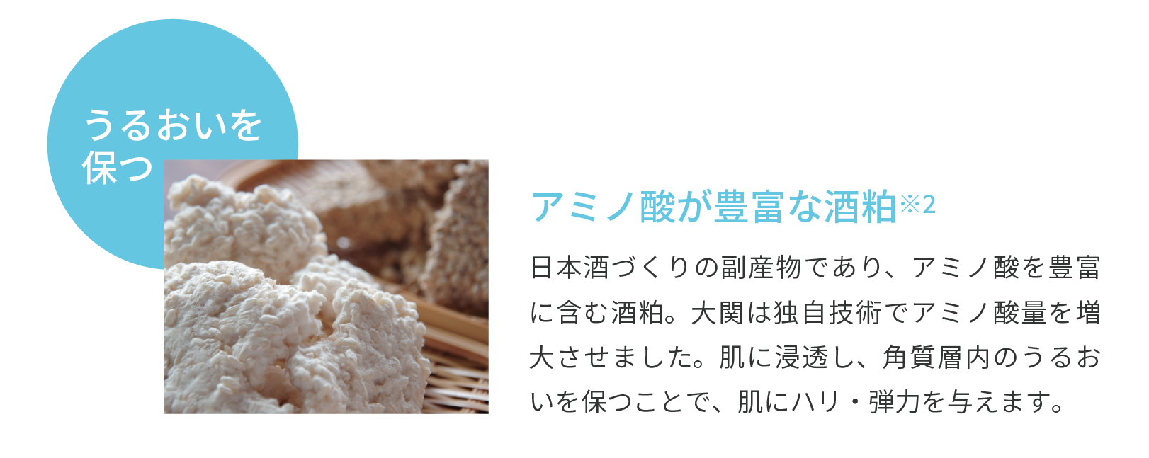 「日本酒*¹」と「酒粕*²」を長年の研究の中で調合し、大関が独自開発した保湿成分です。