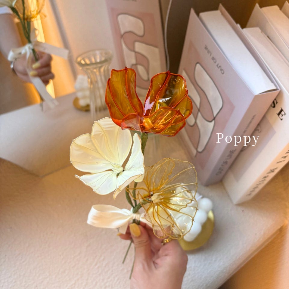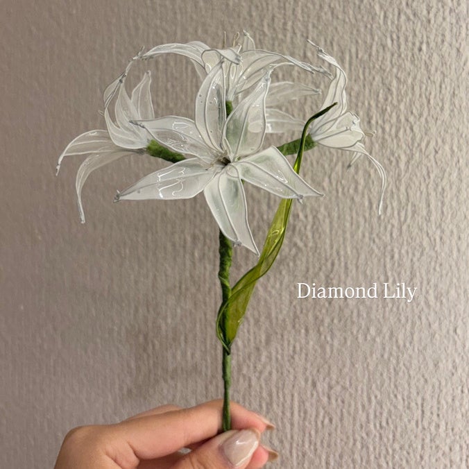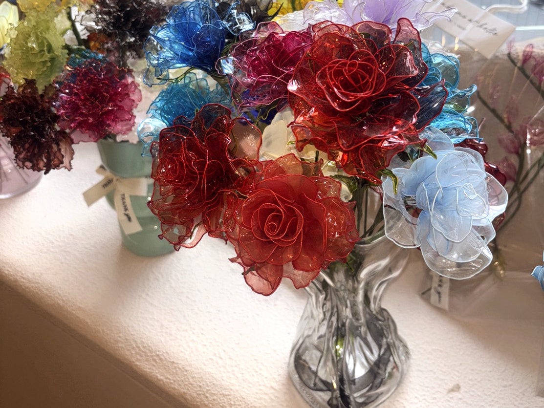 ディップフラワー(Dip Flower)は、ワイヤーで形をつくった花びらを専用の液にくぐらせて膜を張り、ガラス細工のような透明感のある花びらを生み出すクラフトアートです。