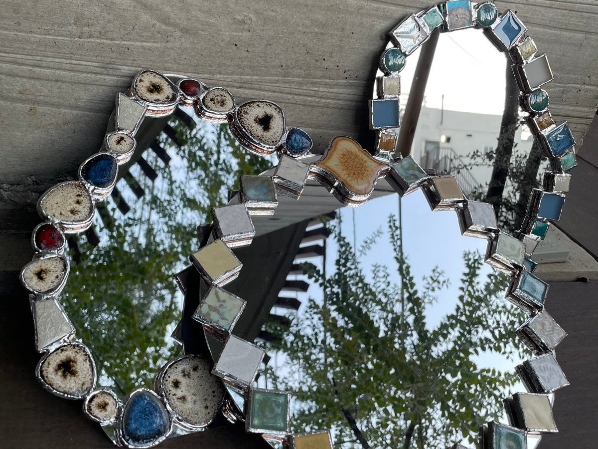 大きな窓から自然光が差し込む明るい空間に、色とりどりの花をかたどった作品が並ぶスタジオ。
