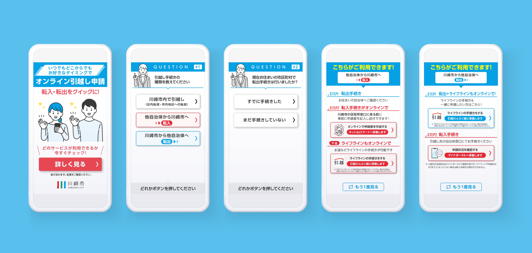 診断結果に基づき、川崎市の「ネットdeスマート」や国の「マイナポータル」、民間の「引越れんらく帳(ライフライン手続)」など、その人に最適な手続きサービスの起動画面や案内ページへ動画から直接誘導します。 これにより、利用者の迷いを解消し、適切な行動を促します。