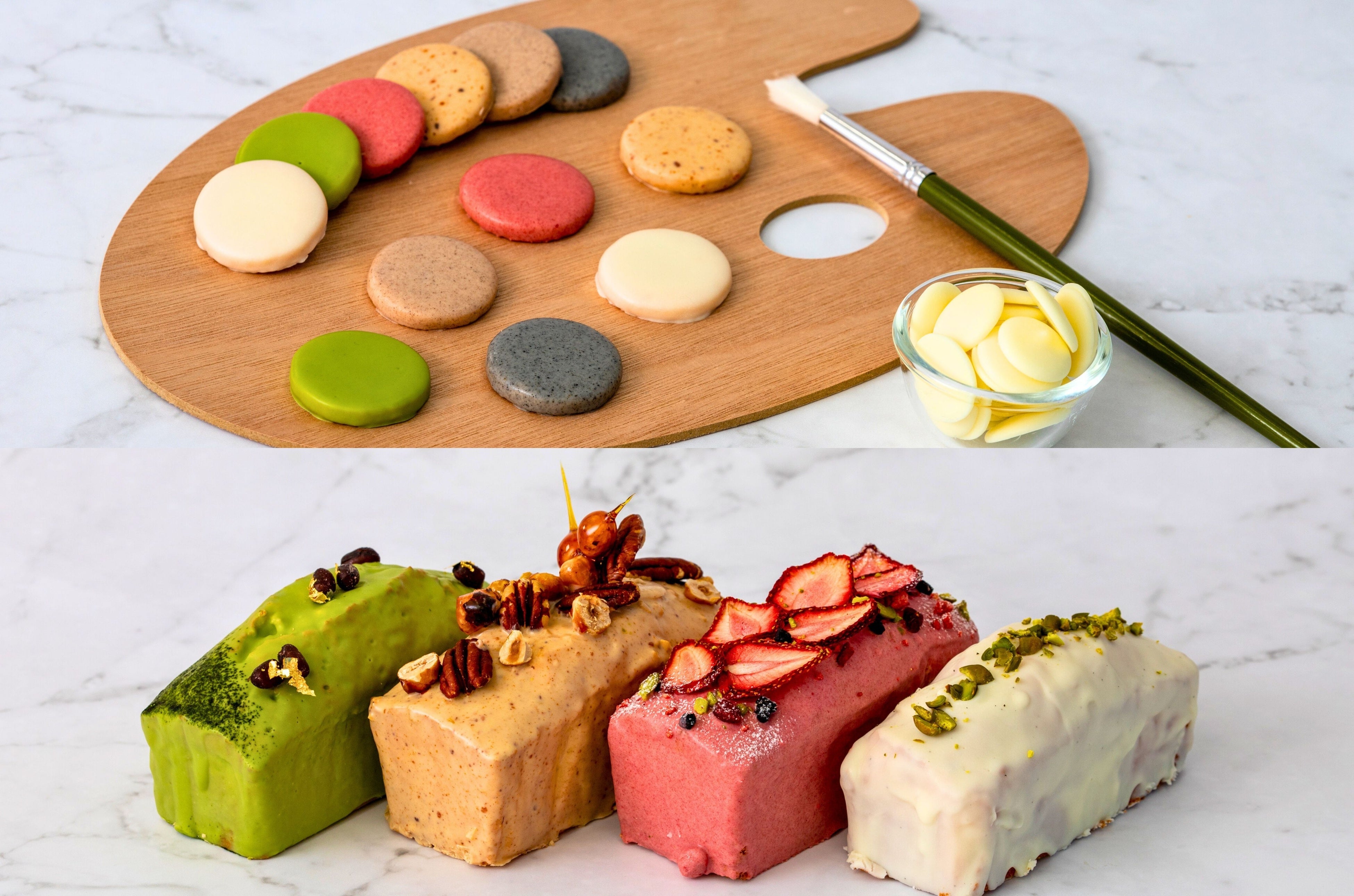 〇 特長:素材のおいしさを描ける機能的なコーティング素材です。テンパリング不要で、合わせる素材の味と色を引き立て、艶やかに固まります。計量も溶解も簡単なペレット形状で、季節やテーマに合わせたアレンジを可能にします。
