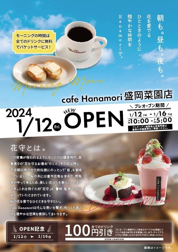 cafe Hanamori盛岡菜園店では1月12日(金)~1月16日(火)までOPENを記念して、ご来店のすべてのお客様にドリンク全品100円引きにて提供させていただきます!テイクアウトでもご利用いただけますので、この機会にぜひご利用ください。