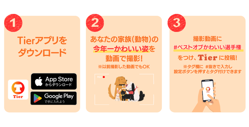 #ベストオブかわいい選手権 のハッシュタグをつけた、あなたのご家族(動物)の今年1番かわいい動画をTierアプリ内に投稿していただき、優秀賞に選ばれた動画を、2024年2月1日(木)〜2024年2月29日(木)までの1ヶ月間、日本最大級の縦型ビジョン 渋谷愛ビジョンにて放映させていただきます。