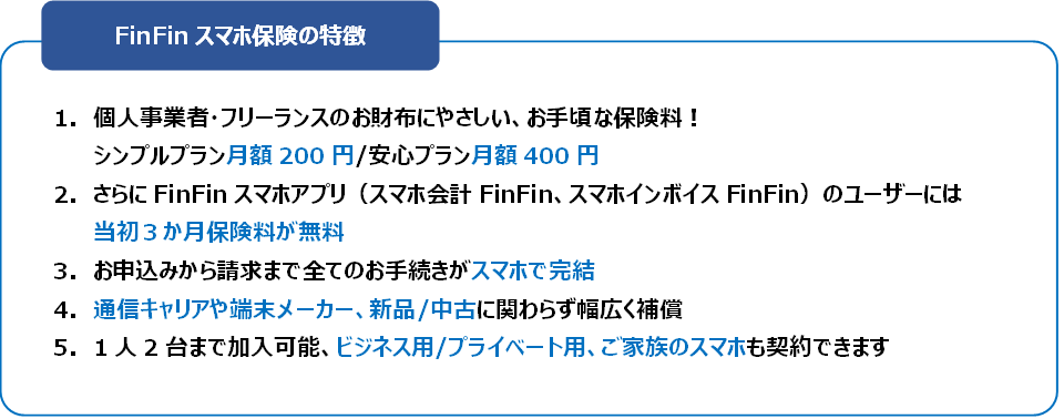 そういった課題解決に少しでもお役に立ちたいと考え、会計バンクは、同社が提供するスマホアプリ(スマホ会計FinFin、スマホインボイスFinFin)のユーザーには特別に、FinFinスマホ保険の保険料を3か月無料でご案内します。※3か月分の保険料は会計バンクが負担します。