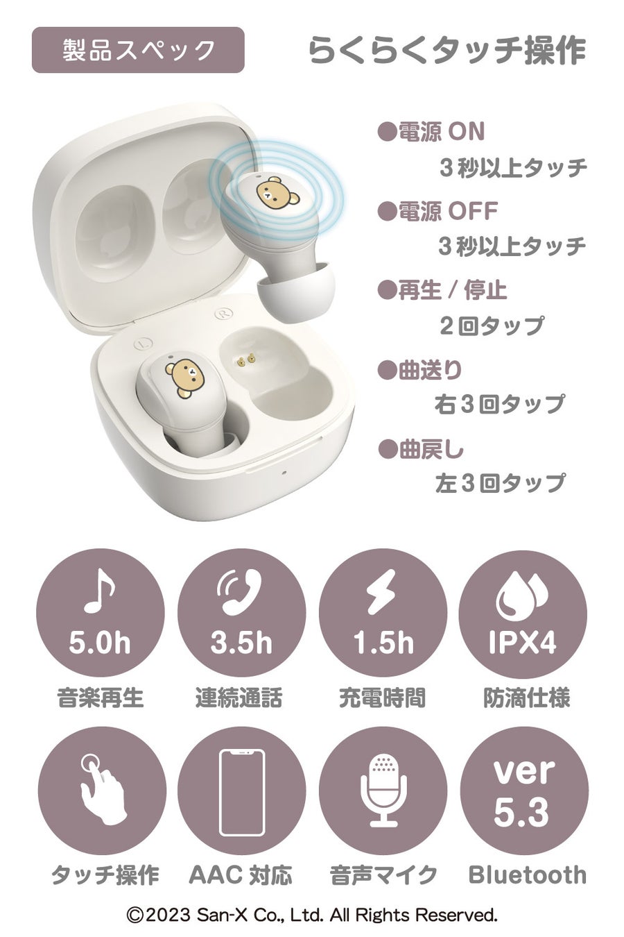 イヤホン本体部には、リラックマ コリラックマたちのキャラクターを左右にプリント。タッチするだけで電源のON・OFFや音楽の再生・停止などが可能です。端末を取り出して操作する必要がなく、優れた操作性を実現しました。