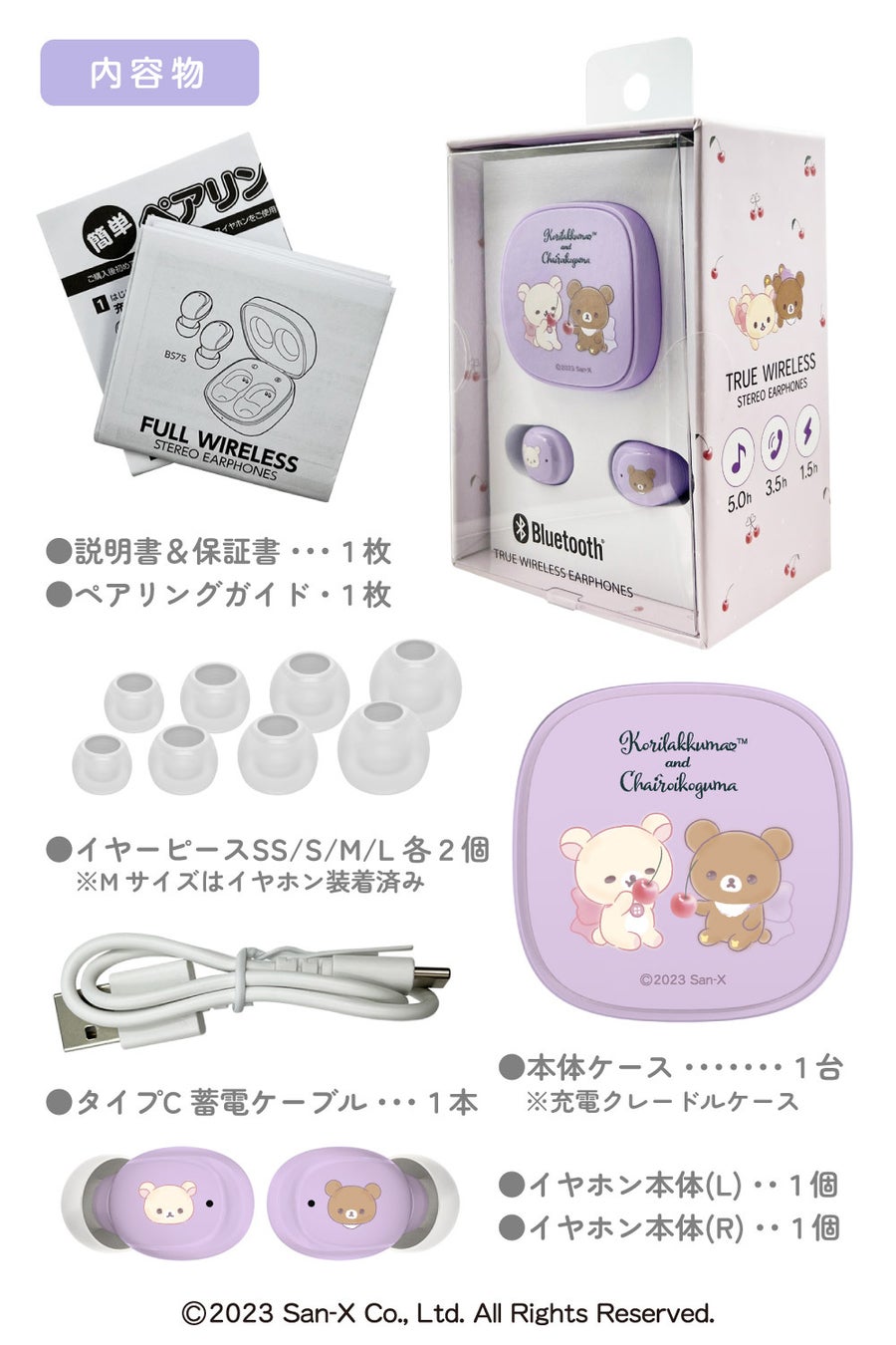充電クレードル部は各色に異なるリラックマたちをあしらいました。約31gと手のひらサイズのコンパクトかつ軽量でありながら、イヤホン充電最大約2回を確保しました。また、給電用USB-Cポートを備え、約30cmの充電ケーブルが付属します。