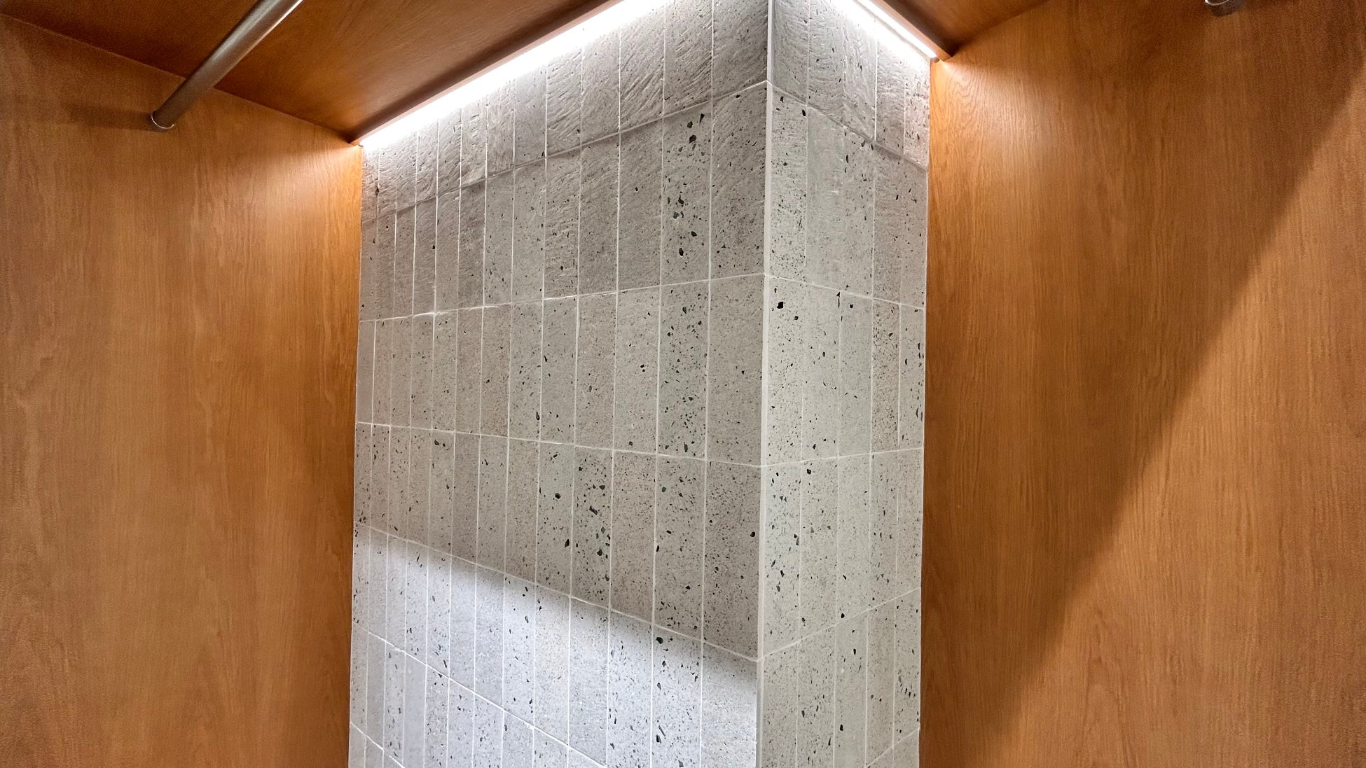今回採用されたamuca®タイルは、ホワイトセメントを原料に、廃棄予定だった漁具やガラス瓶を混ぜ込んでいます。ホワイトを基調とした洗練されたミニマルデザインで店舗空間に自然に溶け込んでいます。近くで見ると、裁断された漁網も確認できます。漁具のアップサイクルであることをテクスチャーで表現すると同時に、emmiのコンセプトであるクリアモードやサステナブルのキーワードを体現しました。