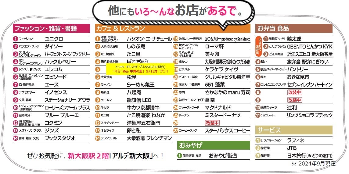「アルデ新大阪」(運営会社:新大阪ステーションストア)は、大阪・関西の玄関口である新大阪駅の2階(改札外)にあるショッピングセンター。関西の食文化にこだわりながら、出先で便利なお店を揃えております!