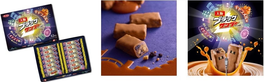 パッケージは光り輝くブラックサンダーロゴに、大阪の夜の街並みをネオン風に表現した大阪らしいインパクトのあるデザイン。この機会に是非お買い求めください。