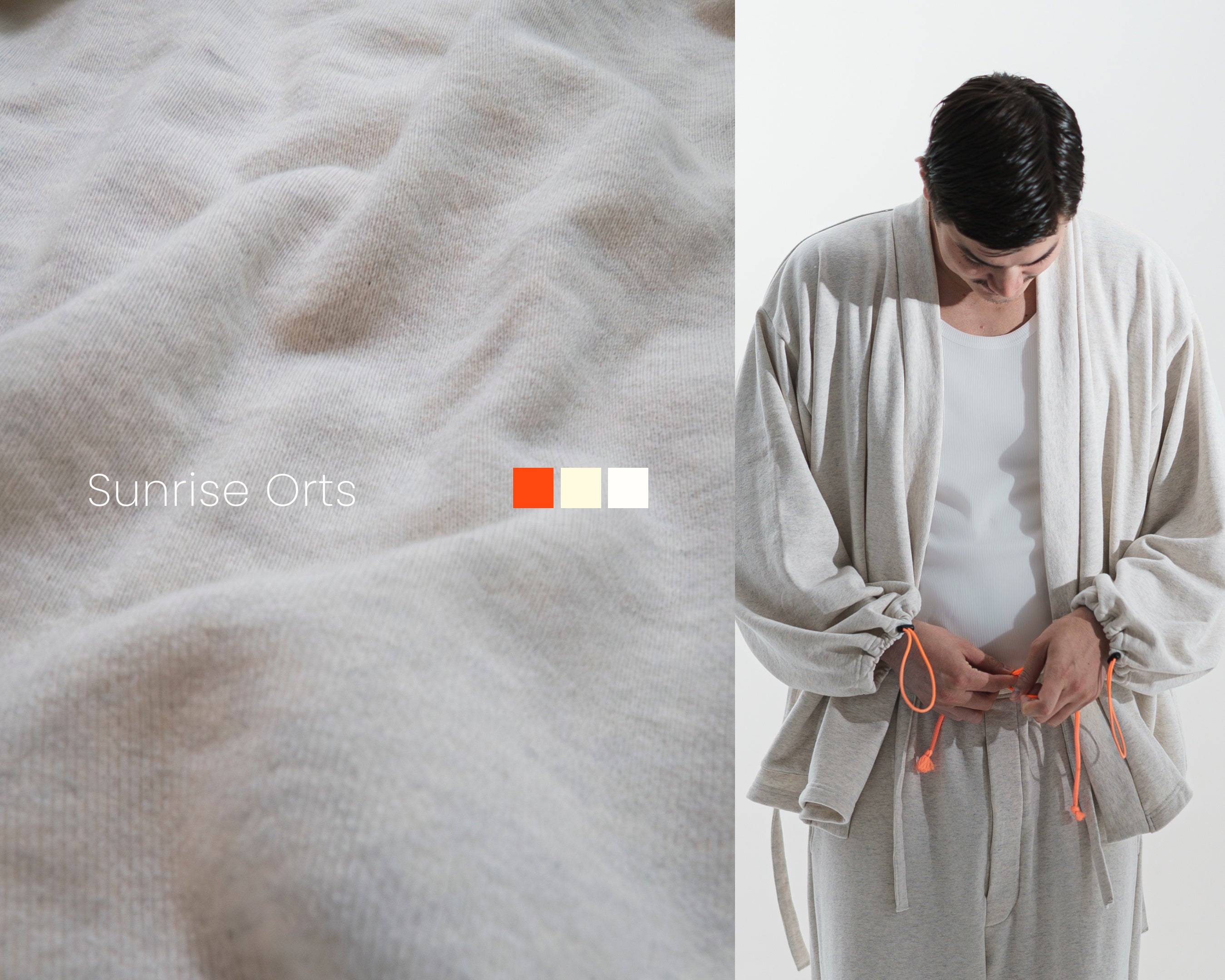 和歌山の東式織機を使用した肌触りの良いスウェット素材を活かし、従来の作務衣よりもリラックスフィットな作りにすることでより肩肘の張らない快適なプロダクトへ。 袖と裾には遊び心のあるヴィヴィットカラーのドローコードを採用し、自分好みのシルエットやシーンによって丈を調整できるなど、リラックスシーン以外にも現代のあらゆるシーン(=Some way)に対応。着物よりもカジュアル、作務衣よりもドレッシーな和服としてのリラックスセットアップ。2サイズ、Sunrise oats、Midnight navyの2色展開。