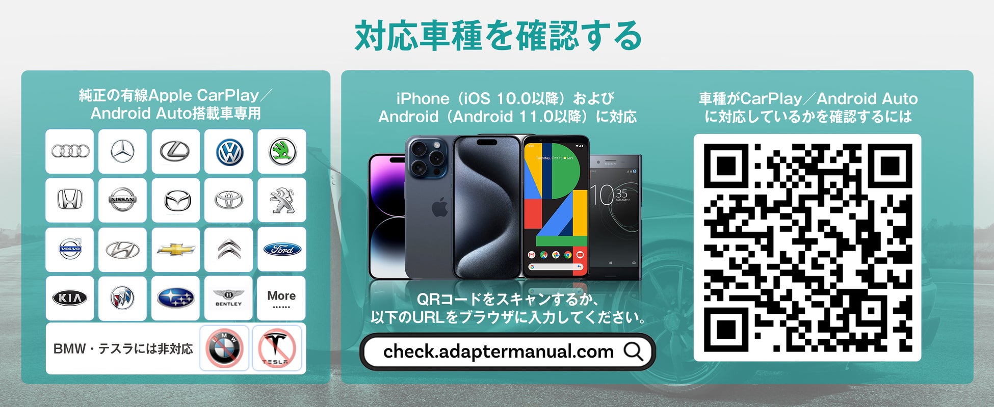iPhone(iOS 10.0 以降)と Android(Android 11.0 以降)のスマートフォンをサポートしており、車両が CarPlay/Android Auto に対応しているかどうかを、QR コードをスキャンするか、check.adaptermanual.comにアクセスすることで簡単に確認できます。