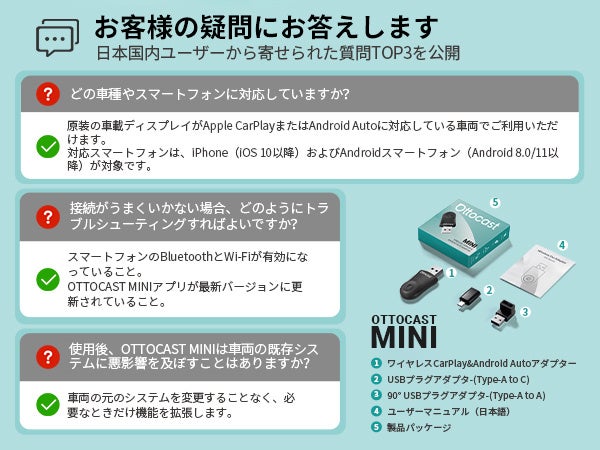 今後もOTTOCASTは、最新技術とユーザーの声を活かし、より快適で安全なカーライフを実現する製品づくりに取り組んでまいります。OTTOCAST MINIは、スマートな接続と利便性を追求したワイヤレスアダプターとして、皆様のドライブ体験を一層豊かにすることを目指しています。今後の展開にもぜひご期待ください。