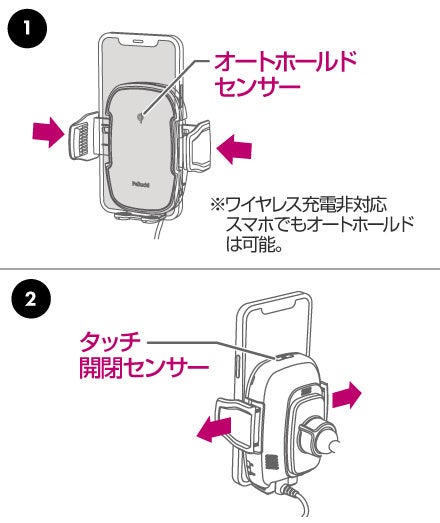 ①スマホを置くとオートホールドセンサーが反応し、オートホールド&オートスキャン&ワイヤレス充電。
