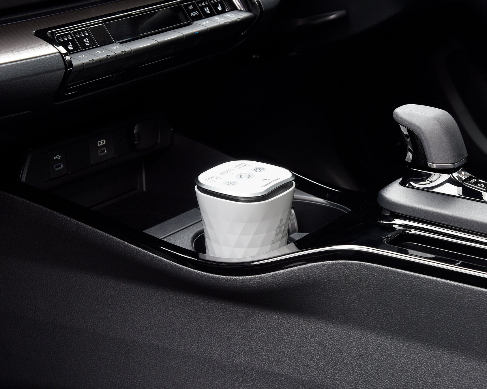 クリーンエイト ポータブルは本体をドリンクホルダーにおいて、USB電源へ接続するだけの簡単設置のた