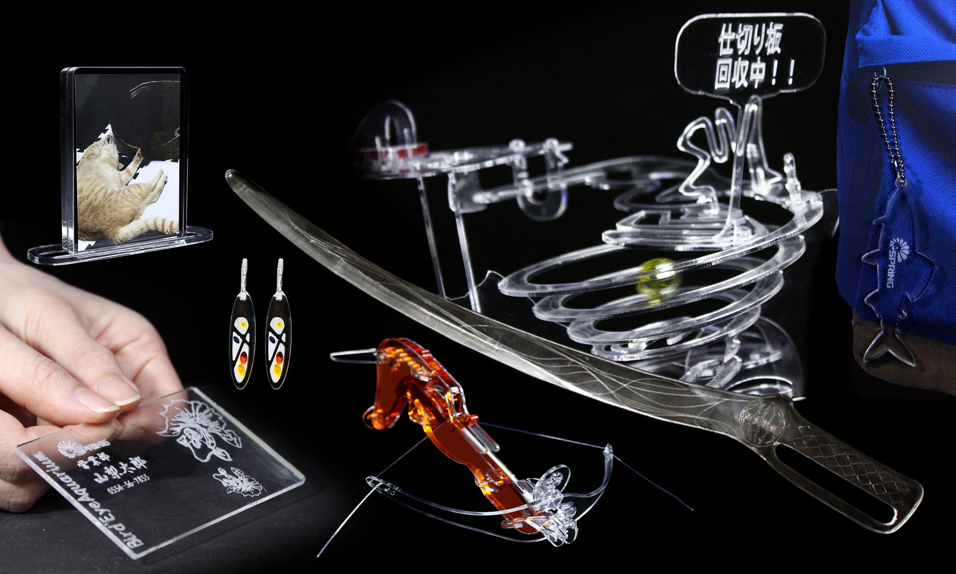 高い透明度と加工精度を持ち、ノベルティや雑貨、ディスプレイ製品に最適。