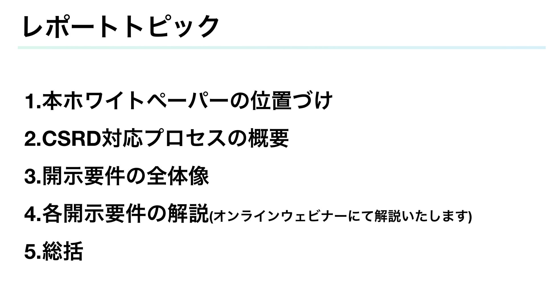 本レポートでは、2023年1月5日に発効したEUの企業サステナビリティ報告指令(CSRD)について調査しています。主に開示要件のうち横断的基準についての解説や具体的な対応方法をまとめました。