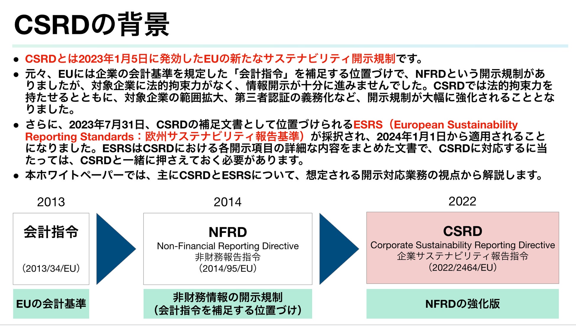 CSRDとは2023年1月5日に発効したEUの新たなサステナビリティ開示規制です。元々、EUには企業の会計基準を規定した「会計指令」を補足する位置づけで、NFRDという開示規制がありましたが、対象企業に法的拘束力がなく、情報開示が十分に進みませんでした。CSRDでは法的拘束力を持たせるとともに、対象企業の範囲拡大、第三者認証の義務化など、開示規制が大幅に強化されることとなりました。