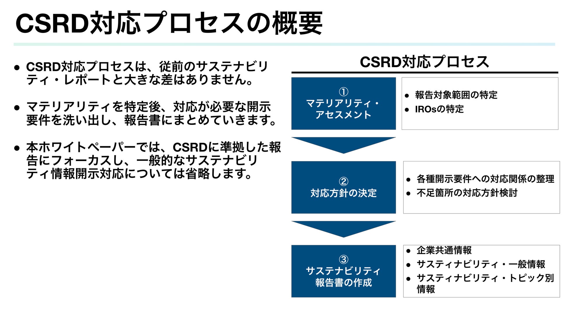 CSRD対応プロセスは、従前のサステナビリティ・レポートと大きな差はありません。マテリアリティを特定後、対応が必要な開示要件を洗い出し、報告書にまとめていきます。