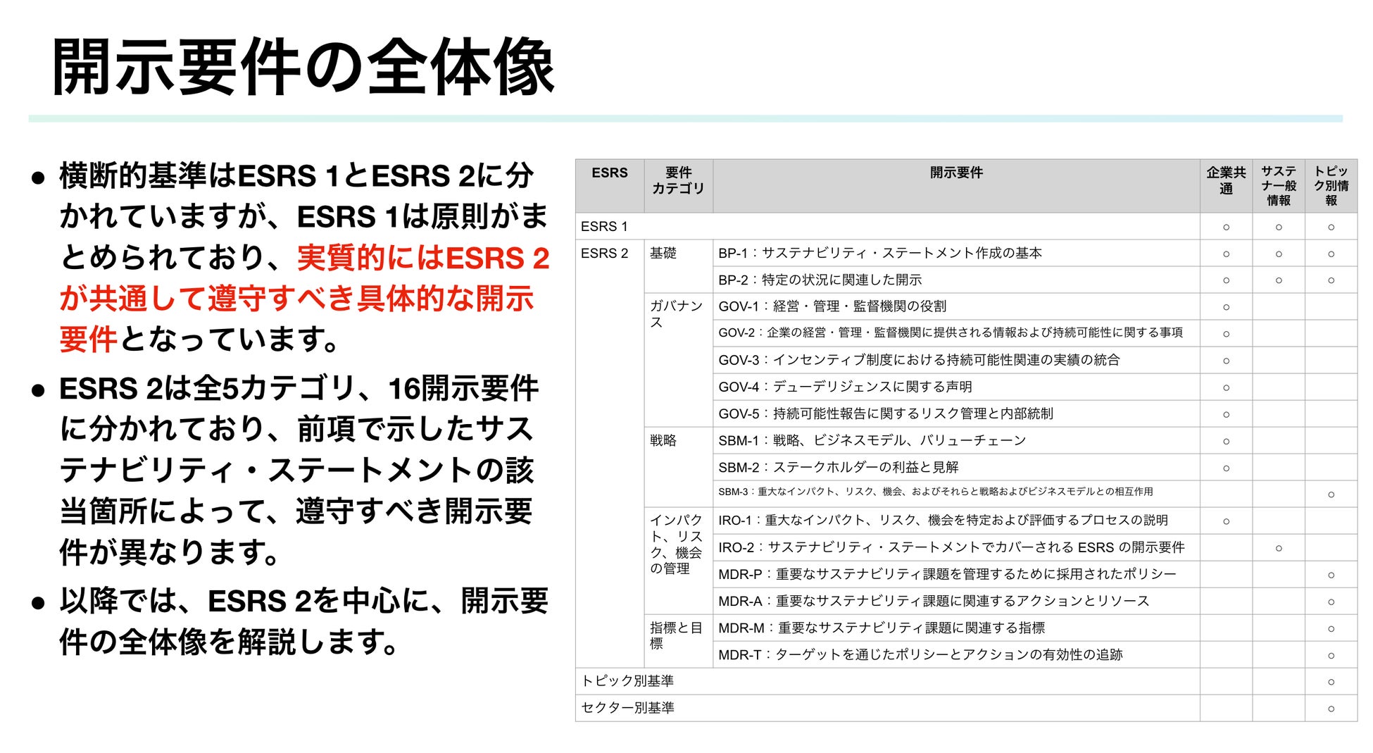 横断的基準は、ESRS1とESRS2に分かれていますが、ESRS1は原則がまとめられており、実質的にはESRS2が共通して遵守すべき具体的な開示要件となっています。