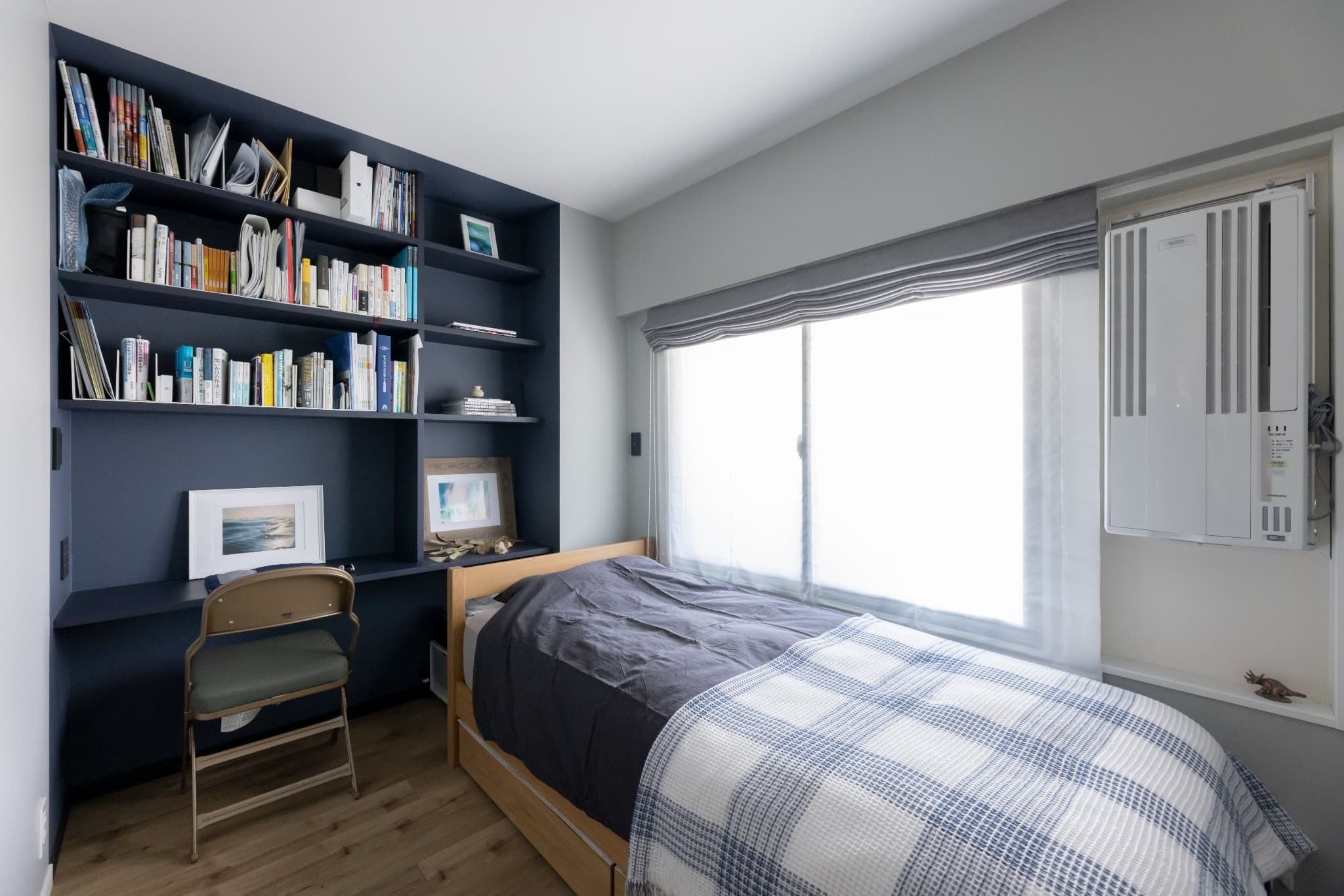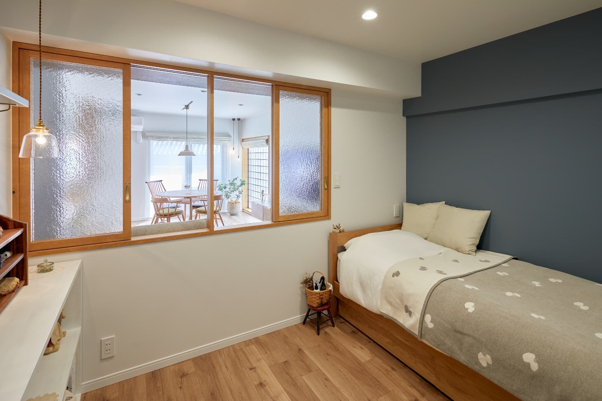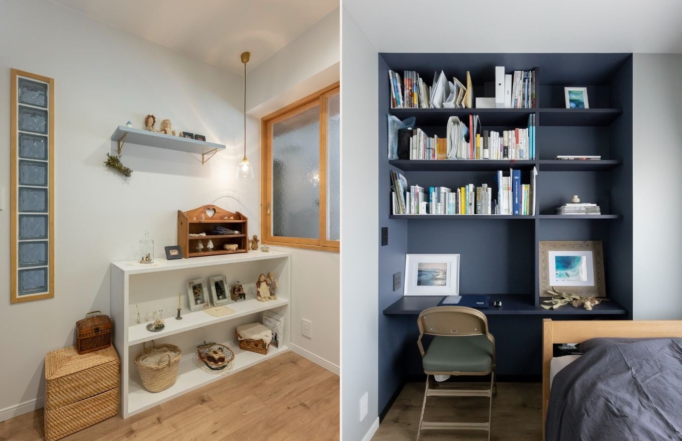 ご主人様の部屋は、柱との凹凸を利用したワークスペースを計画。奥様の部屋は、リビングからの空気を通すための室内窓や好きな小物を飾るための収納ケースなどを造作しました。