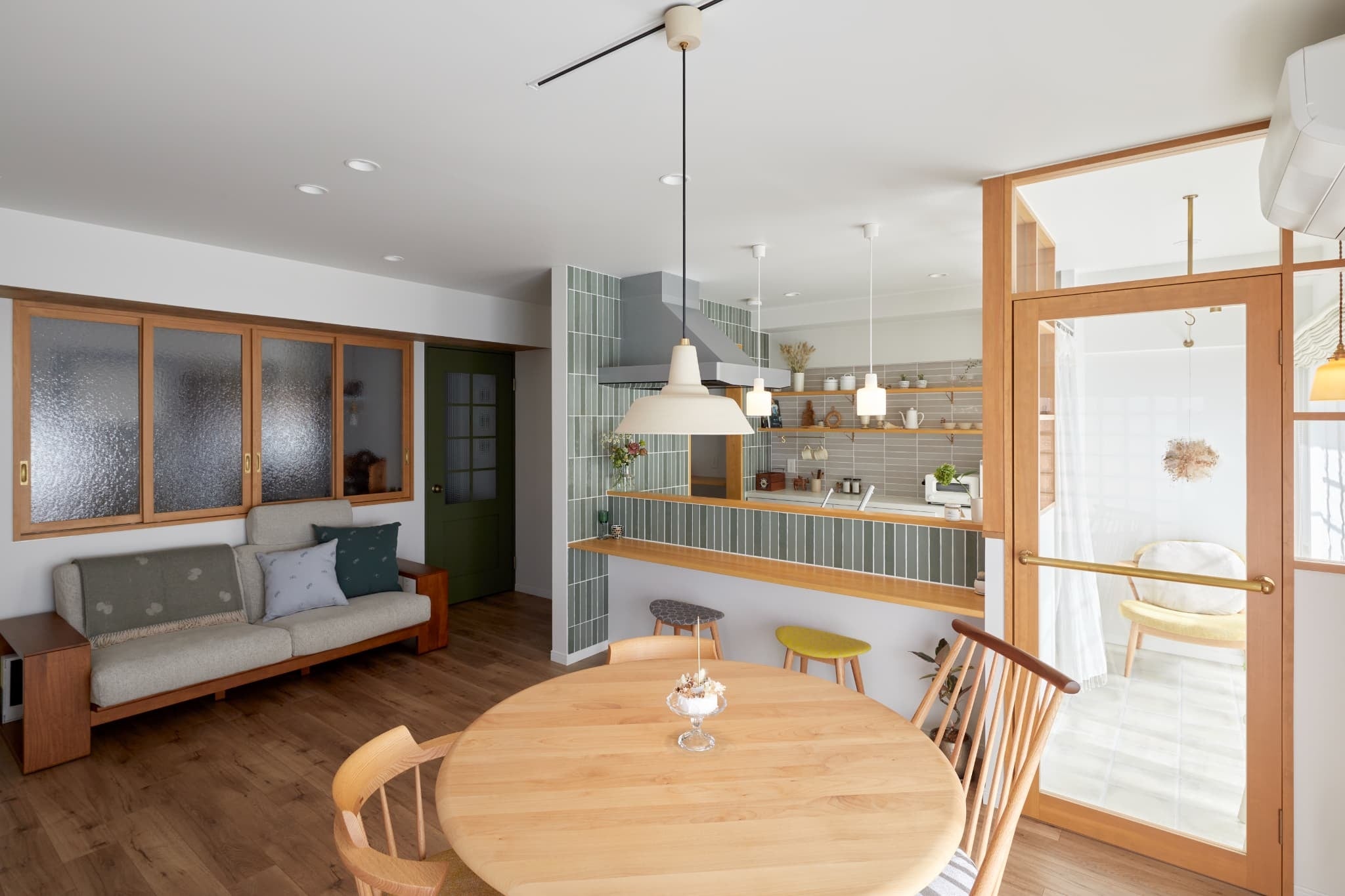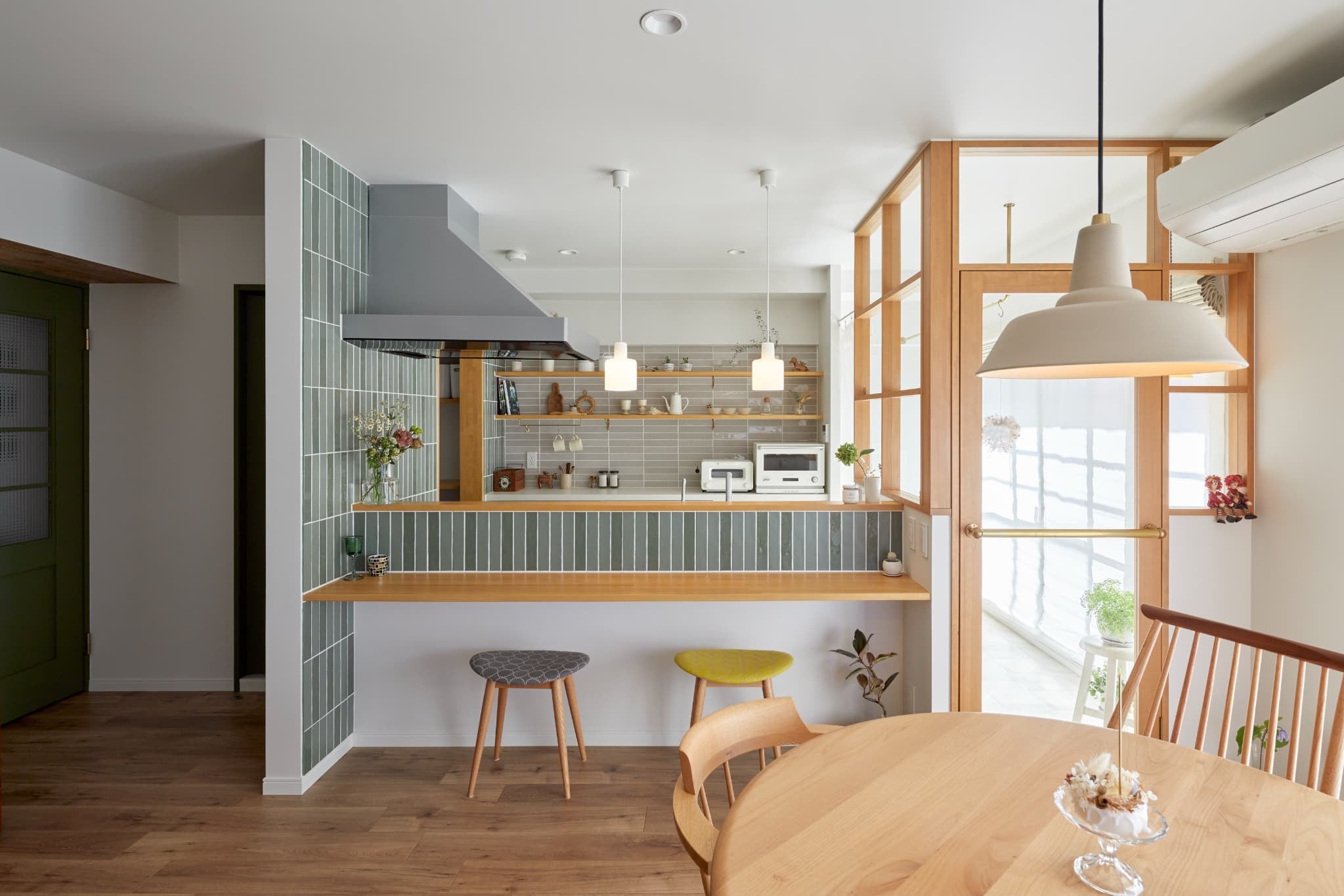 夏は暑く、暗くて狭かったキッチンを開放的にするために、キッチンの位置を移動することで風通しが良い、開放的なキッチン空間へ生まれ変わりました。キッチンカウンターから背面収納部分に貼ったこだわりの輸入タイルが印象的。