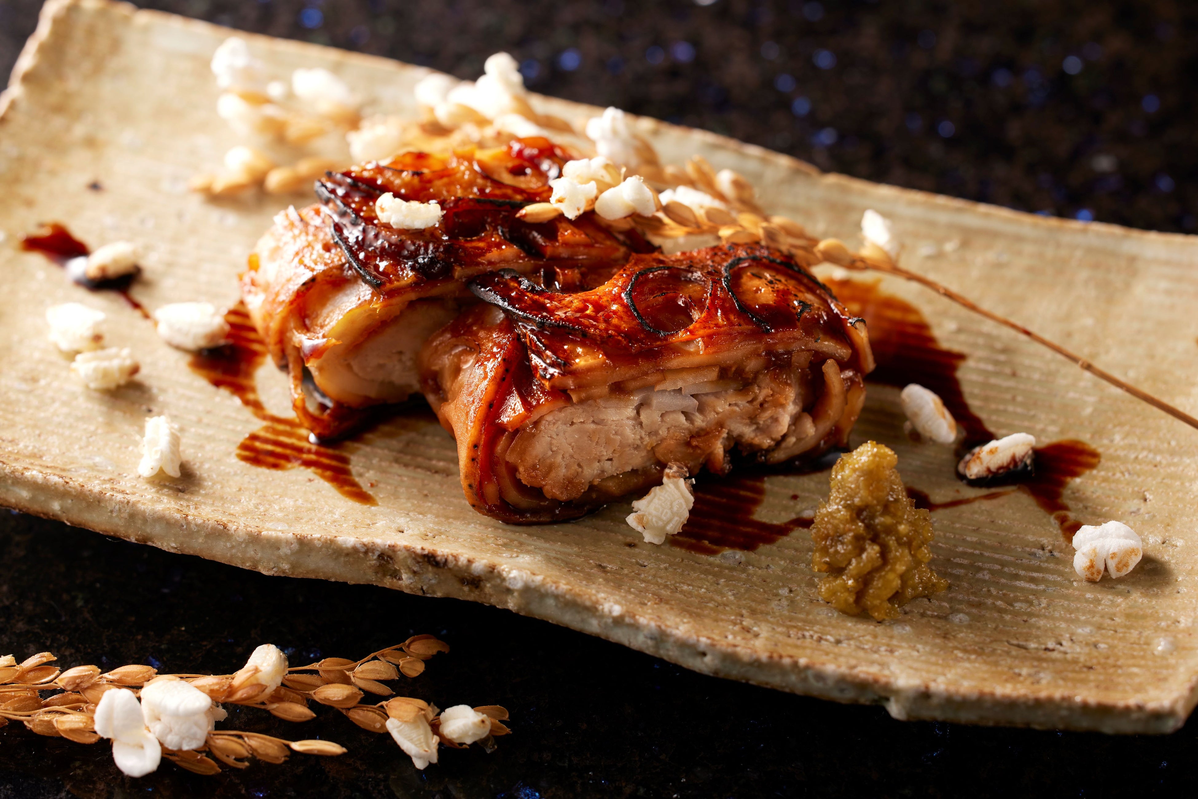 OMIKAコースとOYAMAコースでは、鶏腿肉の特製つくねを薄くスライスした蓮根で包み込み、炭火でじっくりと焼き上げた挟み焼きをご提供します。添えられた揚げ稲穂が、秋の趣を一層引き立てます。OMIKAコースのメイン料理には、シェフお勧め和牛と季節の野菜の炭火焼きをご用意しております。
