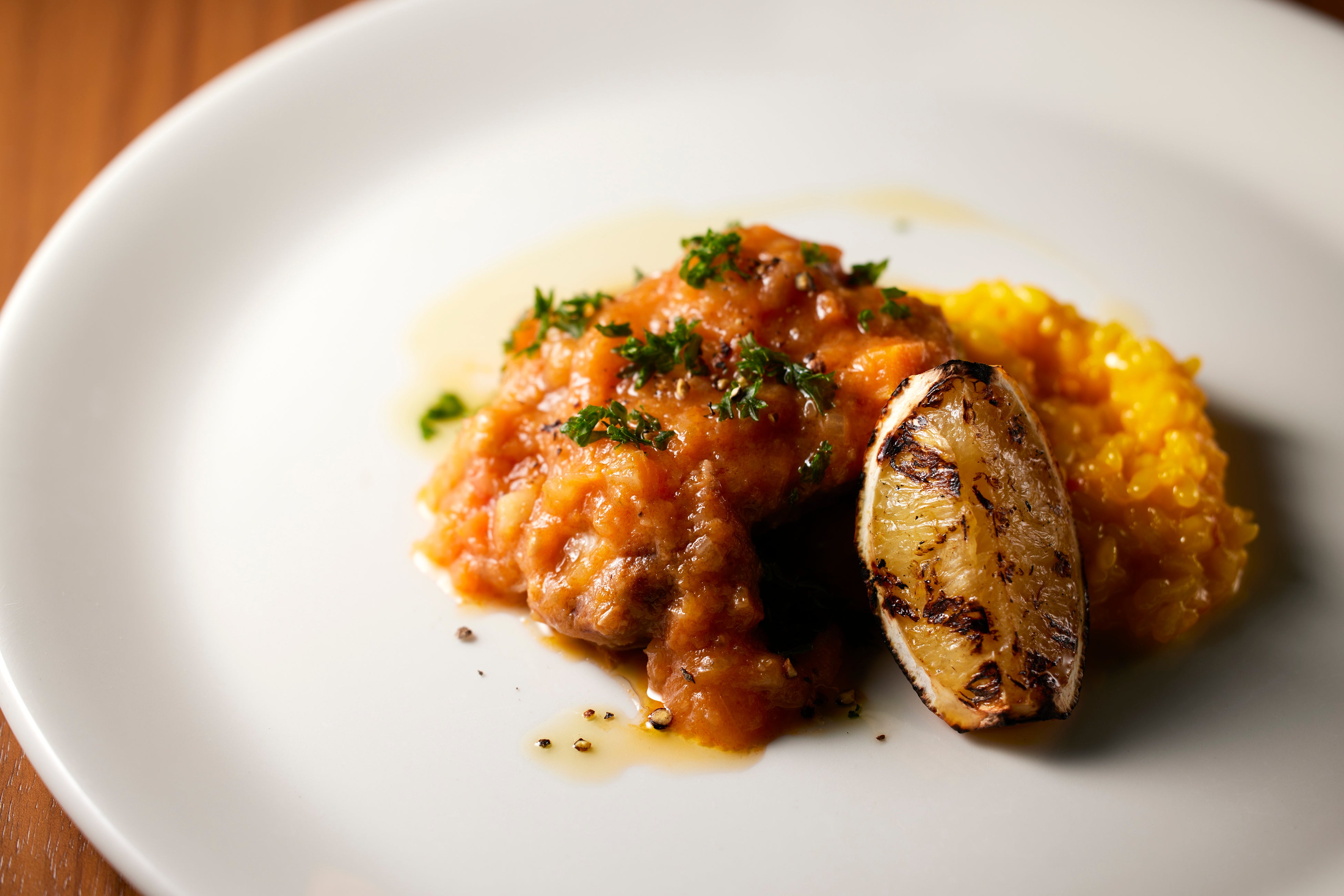 メインディッシュの一押しは、ミラノを代表する伝統料理「オーソブッコ」を秋の風情に合わせ、鴨腿肉を使用してアレンジした白ワイン煮込みです。トマトとオレンジの爽やかな風味で仕上げられ、ほろほろとほぐれる柔らかさが魅力です。黄金色に輝くサフラン風味のリゾットを添え、本格的なイタリアンの味わいを存分にお楽しみいただけます。秋のまだ残暑が残る日でも、爽やかに味わっていただける一品です。