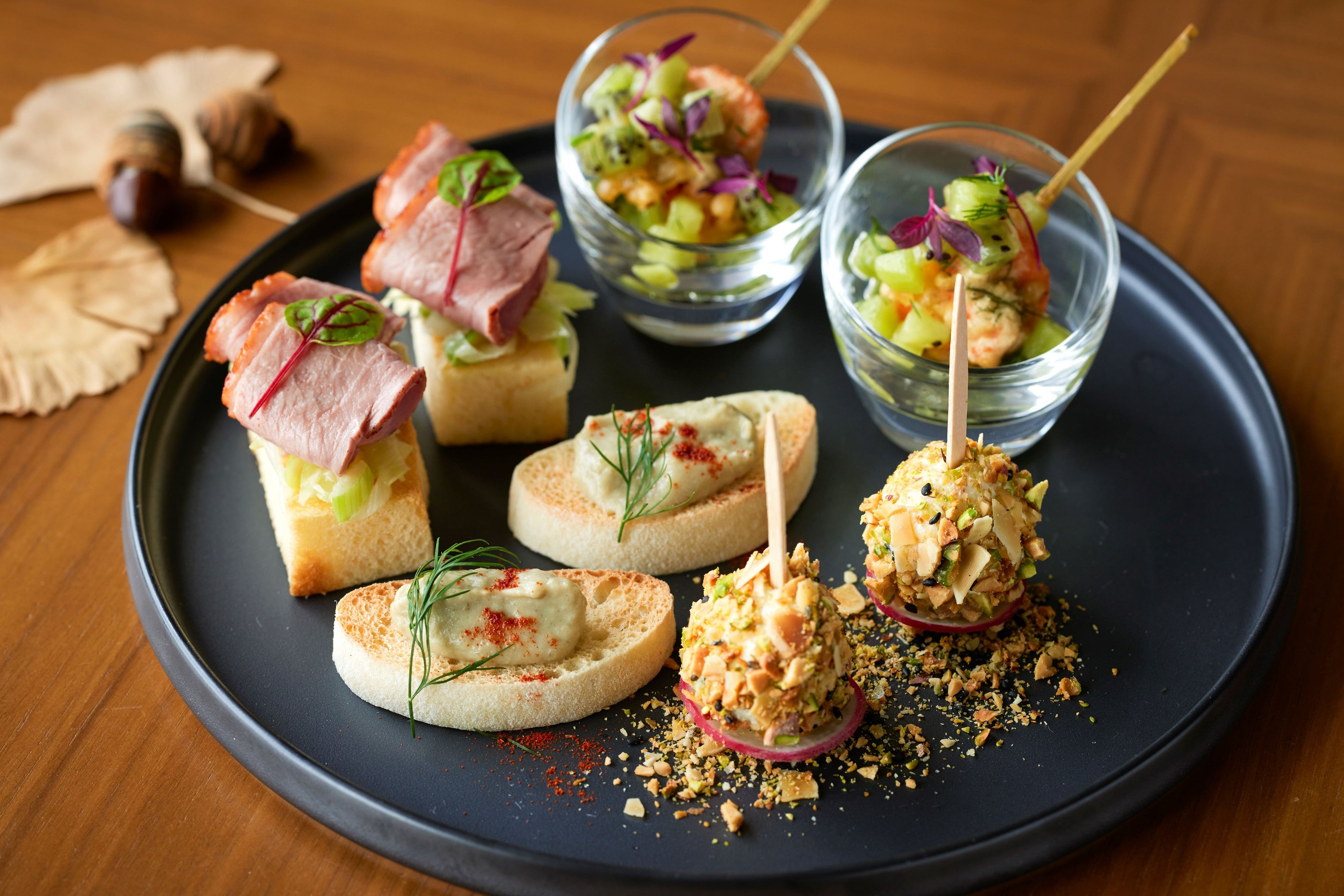 セイボリーとしては、鴨胸肉と地域の特産である甘い根深ネギのフォンダンをのせたブリオッシュや、小山町金太郎ますのフリット、静岡県産折戸茄子と胡麻のペーストをのせたチャバタブレッド、そして、静岡県産クリームチーズといちじくのジャムに黒ゴマやアーモンドの食感が楽しいピンチョスをご用意します。