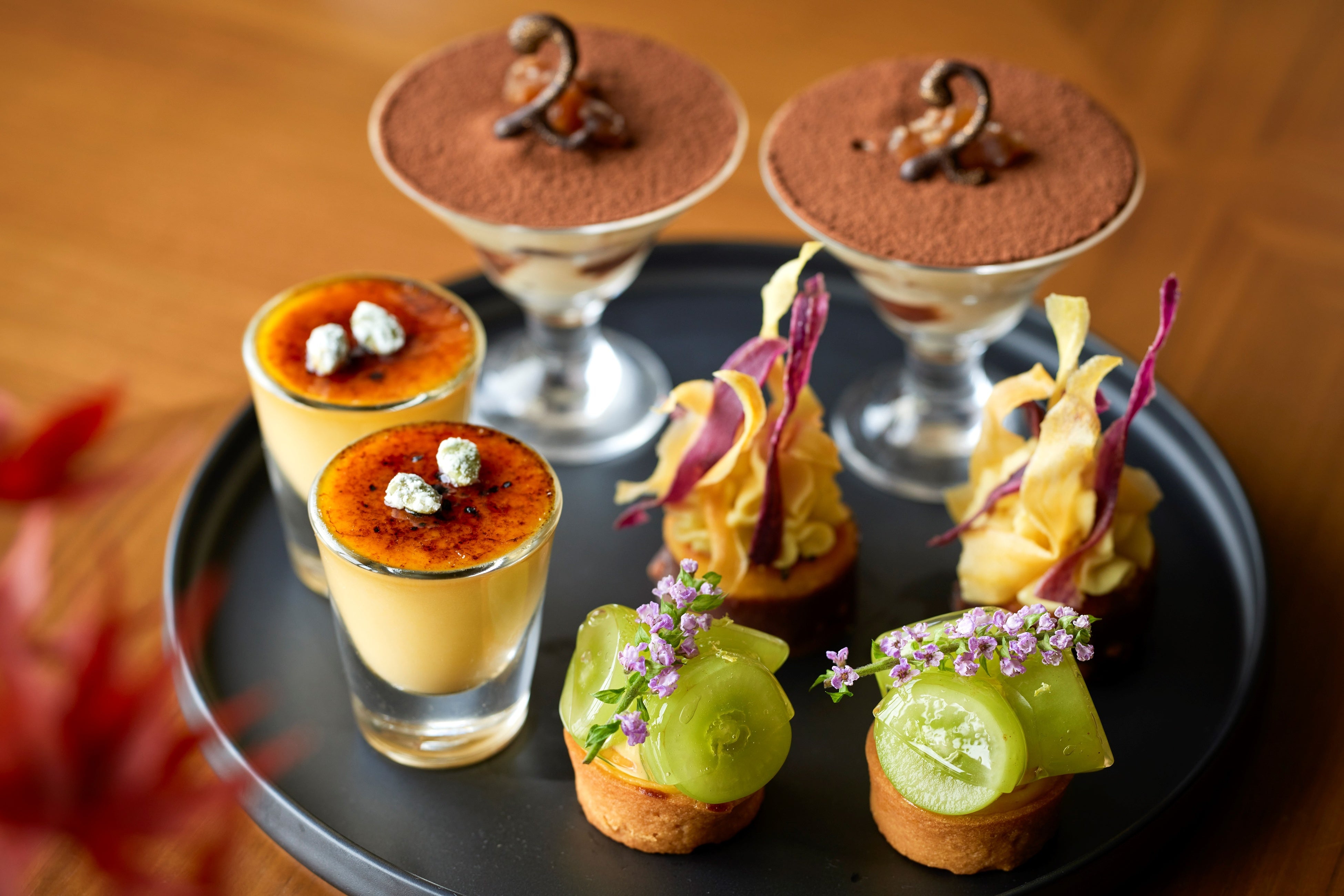 スイーツ4種のなかでも、2023年にグッドエッグアワードを受賞した静岡県産ケージフリー卵「福が、きた」を使用したシャインマスカットのタルトは、旨味たっぷりの黄身の甘さと、果汁が溢れるフレッシュなシャインマスカットとの相性が抜群です。表面をキャラメリゼしたかぼちゃのプリンは、箱根西麓南瓜ならではの上品な甘みをお楽しみいただけます。また、静岡県産のサツマイモを使用したモンブランは、秋風を感じさせるような美しい2色のサツマイモチップスが視線を惹きつけます。そして、静岡県産ほうじ茶スポンジと栗を合わせたティラミスには、ホテル開業2周年を記念したチョコレート細工が添えられています。