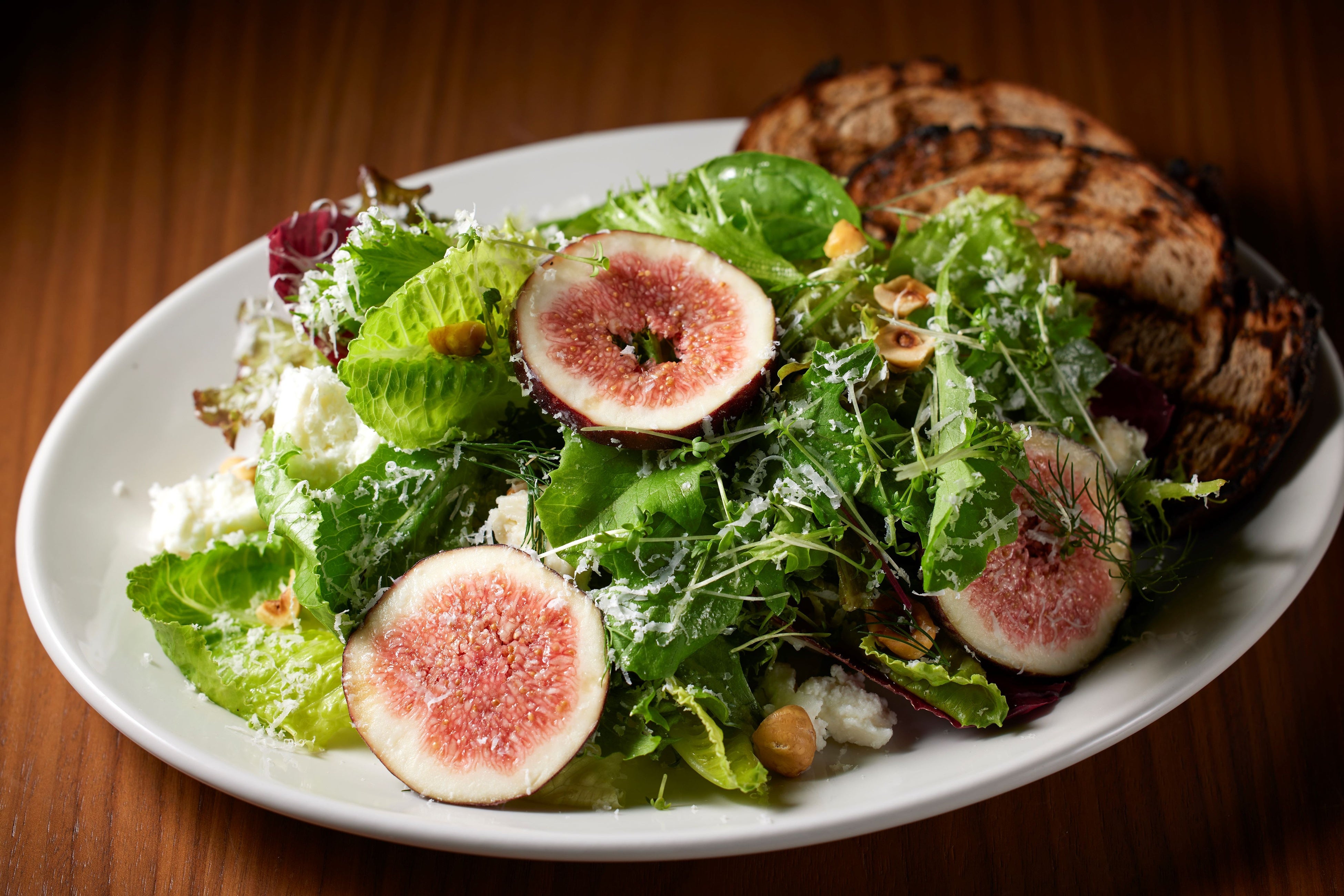 季節のフルーツサラダは無花果をトッピングし、食感がさまざまな葉野菜がたっぷりと盛り込まれています。静岡県産のカッテージチーズとの相性が抜群の甘酸っぱいはちみつレモンドレッシングが味のアクセントを添え、グリルした田舎風シリアルブレッドが食べ応えをさらに引き立てます。