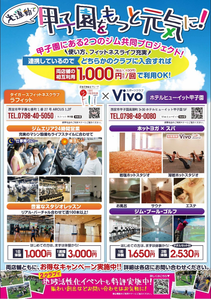 株式会社サップス(本社:兵庫県西宮市、社長:中瀨 敏和)が経営する「スポーツクラブVivo in ホテルヒューイット甲子園」と株式会社ウエルネス阪神(所在地:兵庫県西宮市、社長:岡本 直樹、阪急阪神ホールディングスグループ)が経営する「タイガースフィットネスクラブ ラフィット」は、「運動で甲子園をもっと元気に!」をテーマに運動を通じて甲子園地域の皆様の健康づくりを支援し、地域のウェルビーイングの実現と地域活性に寄与するための合同プロジェクトを立ち上げます。