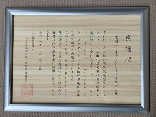 この取り組みに対して岐阜県森林組合から感謝状を受け取りました。