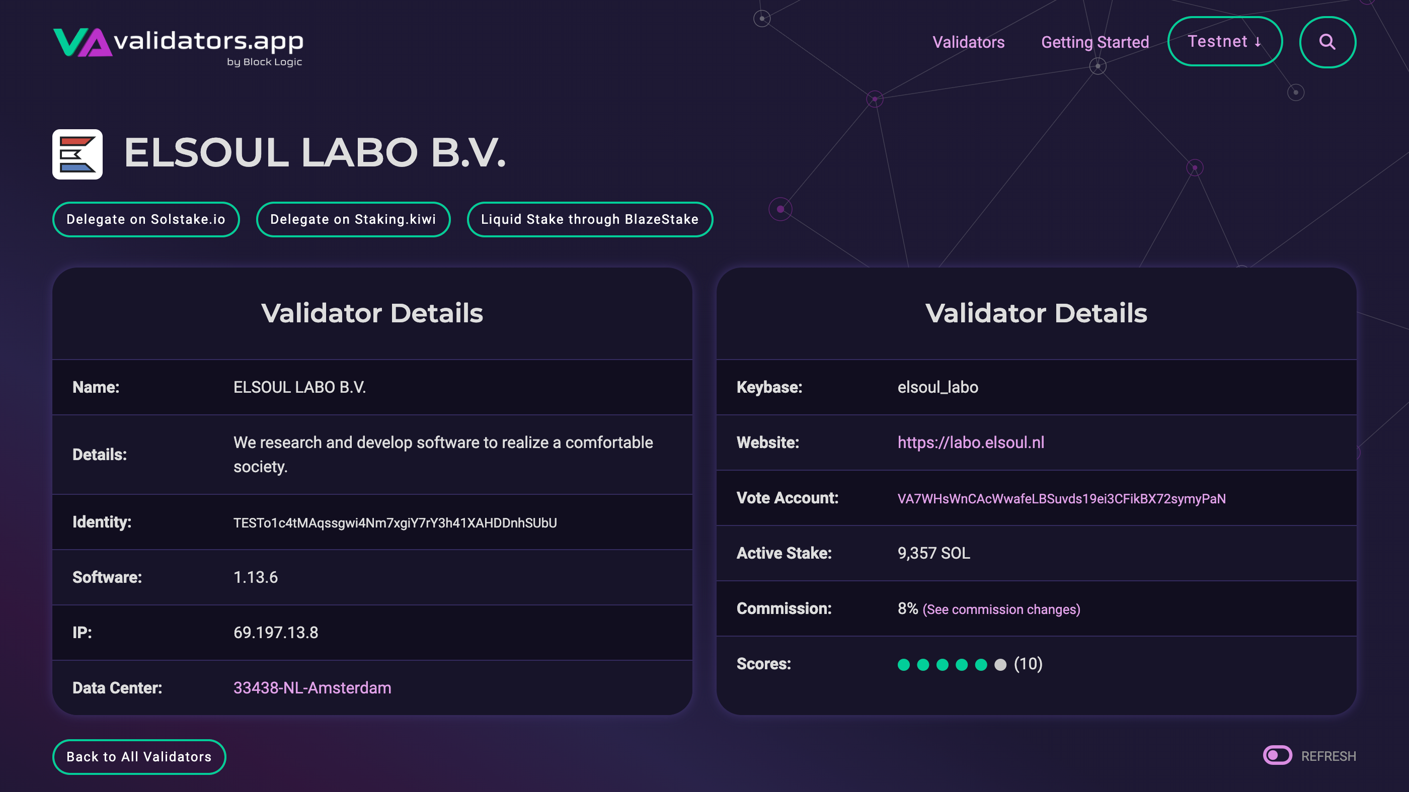 Solana Testnet Validator - ELSOUL LABO B.V.: https://www.validators.app/validators/TESTo1c4tMAqssgwi4Nm7xgiY7rY3h41XAHDDnhSUbU?network=testnet