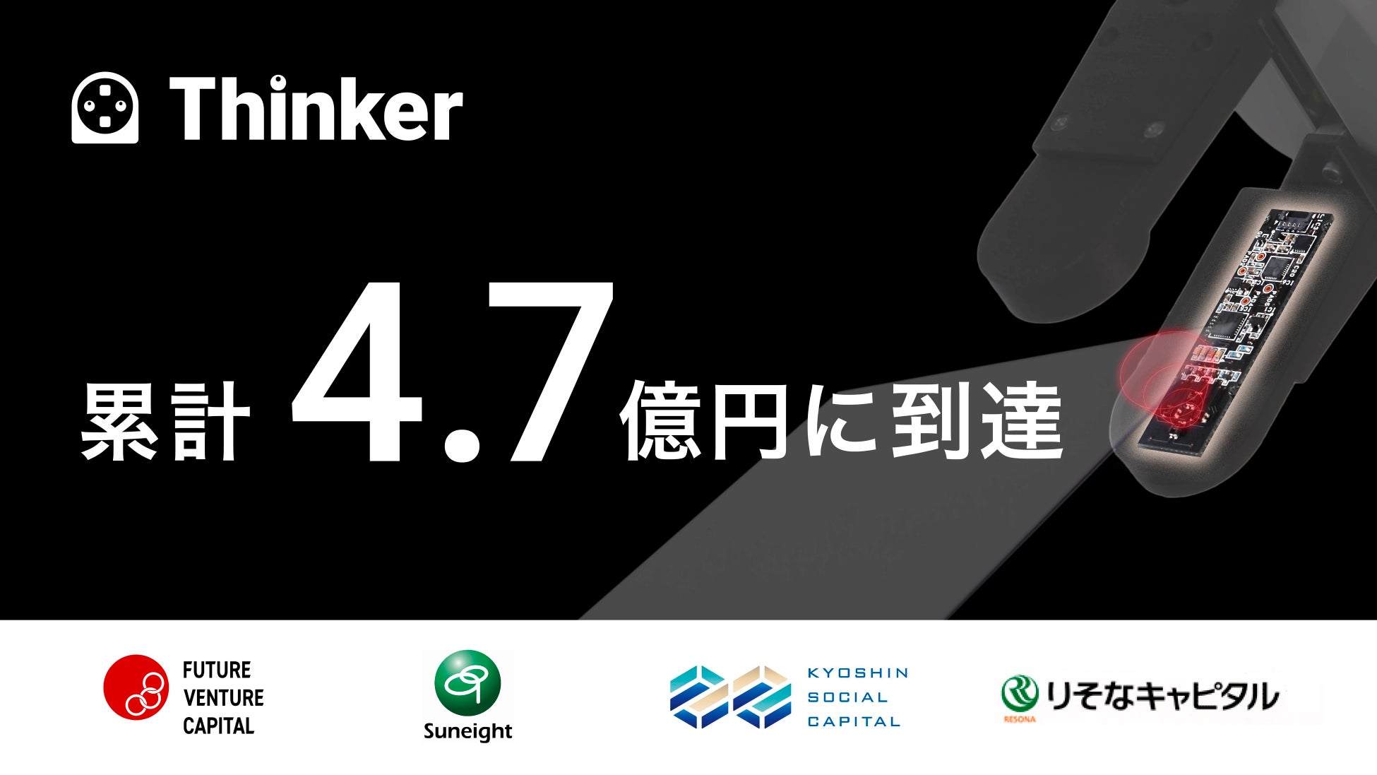 近接覚センサーによって“指先で考えてつかむロボットハンド”を実現する株式会社Thinker(読み:シンカー、本社:大阪府大阪市、代表取締役兼CEO:藤本弘道、以下Thinker)は、フューチャーベンチャーキャピタル株式会社(本社:京都市中京区、代表取締役会長兼社長:澤田大輔)、株式会社サンエイト インベストメント(本社:東京都港区、代表取締役:勝方正英)、株式会社京信ソーシャルキャピタル(本社:京都市下京区、代表取締役:国本丈弘)、りそなキャピタル株式会社(本社:東京都江東区、代表取締役社長:相原直也)を引受先とした第三者割当増資により、1.4億円の資金調達を実施いたしました。これにより、シリーズA(※)ラウンドとしては2023年9月の調達とあわせて総額3.7億円、2022年8月の設立からの累計資金調達額は4.7億円となりました。