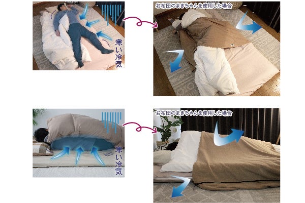 一般的な布団で寝返りをすると横から冷気が入りますが、お布団のまきちゃんを使用することでどんなに寝返りをしても背中が出ないのであたたかく眠れます。